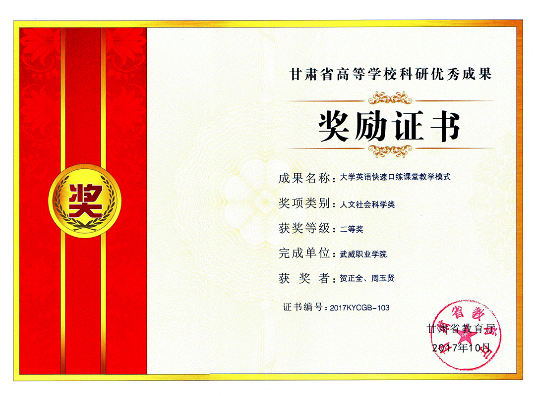 近日從學(xué)院科研處傳來喜訊,我系教師賀正全申報(bào)的《大學(xué)英語快速口練課堂教學(xué)模式》榮獲甘肅省教育廳頒發(fā)的2017年甘肅省高等學(xué)??蒲袃?yōu)秀成果二等獎(jiǎng)。這是我院自建院以來獲得的最高級(jí)別的高??蒲袃?yōu)秀成果獎(jiǎng)。本次獲得二等獎(jiǎng)的科研成果共有154項(xiàng),其中高職高專報(bào)送的科研成果只有9項(xiàng)獲得二等獎(jiǎng)。
