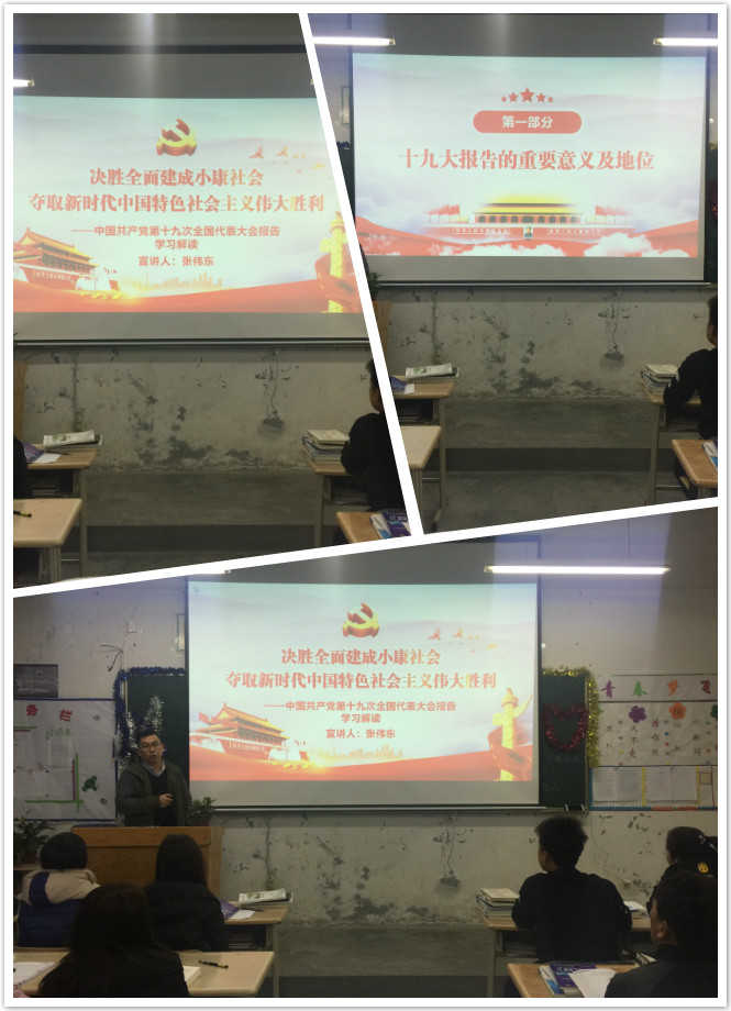12月20日晚自習(xí)時間,在17級計算機網(wǎng)絡(luò)大專班教室,電信系黨員教師張偉東同志給學(xué)生們以《深入學(xué)習(xí)重點解讀十九屆大會議報告精神》為主題,對十九大報告進行了全方位的宣講解讀。