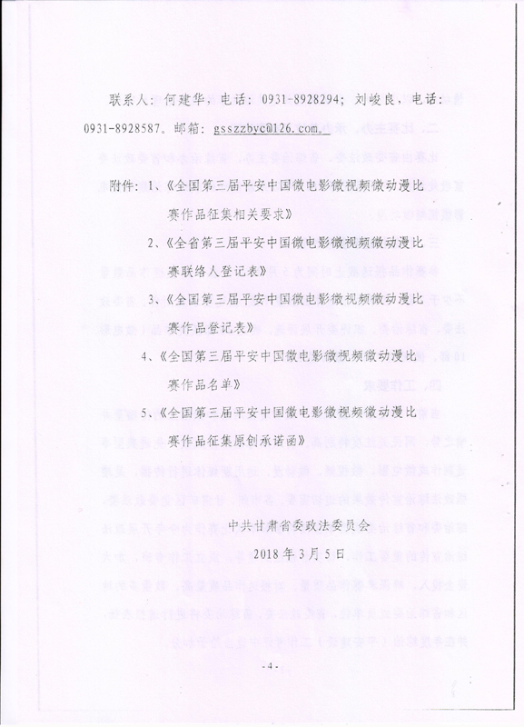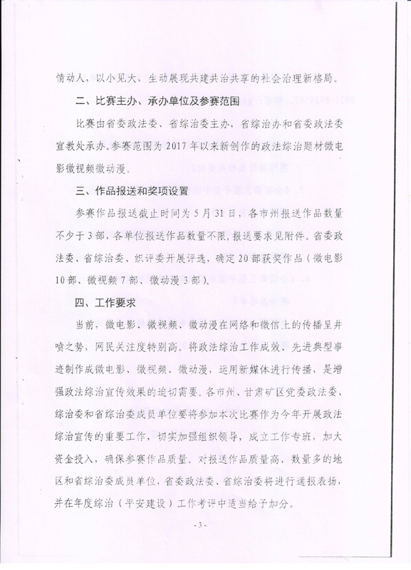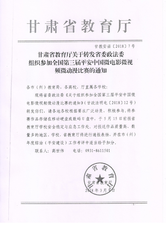 現(xiàn)將甘肅省教育廳關(guān)于轉(zhuǎn)發(fā)《省委政法委<關(guān)于組織參加全國第三屆平安中國微電影微視頻微動漫比賽的通知>》(甘政法明電〔2018〕12號)轉(zhuǎn)發(fā)你們,請各部門、單位根據(jù)要求廣泛動員,積極參與。將參賽作品存儲在移動硬盤或數(shù)碼U盤中,于5月10日前報(bào)宣傳統(tǒng)戰(zhàn)部辦公室,宣傳統(tǒng)戰(zhàn)部對報(bào)送作品匯總后統(tǒng)一報(bào)送省教育廳。