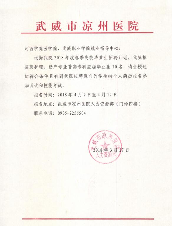 ? ? ? ?武威市涼州醫(yī)院擬招聘護(hù)理、助產(chǎn)專業(yè)畢業(yè)生10名,報(bào)名時(shí)間2018年4月2日~4月12日,報(bào)名時(shí)請攜帶個人簡歷,一寸彩色照片一張,請我系15級應(yīng)屆畢業(yè)生積極響應(yīng),踴躍報(bào)名!