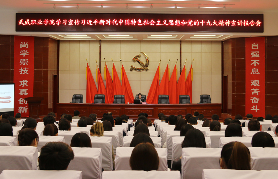 為進一步加強對習近平新時代中國特色社會主義思想和黨的十九大精神的學習宣傳教育,4月9日下午,學院黨委在菁英廳舉行“武威職業(yè)學院深入學習宣傳貫徹習近平新時代中國特色社會主義思想和黨的十九大精神宣講報告會”,邀請武威市委講師團成員、市委黨校副教授蔡生菊為學院各院系師生代表、副科級以上領(lǐng)導干部、直屬附屬醫(yī)院領(lǐng)導共計200余人作宣講報告。宣講報告會由宣傳統(tǒng)戰(zhàn)部部長王繼林主持。
