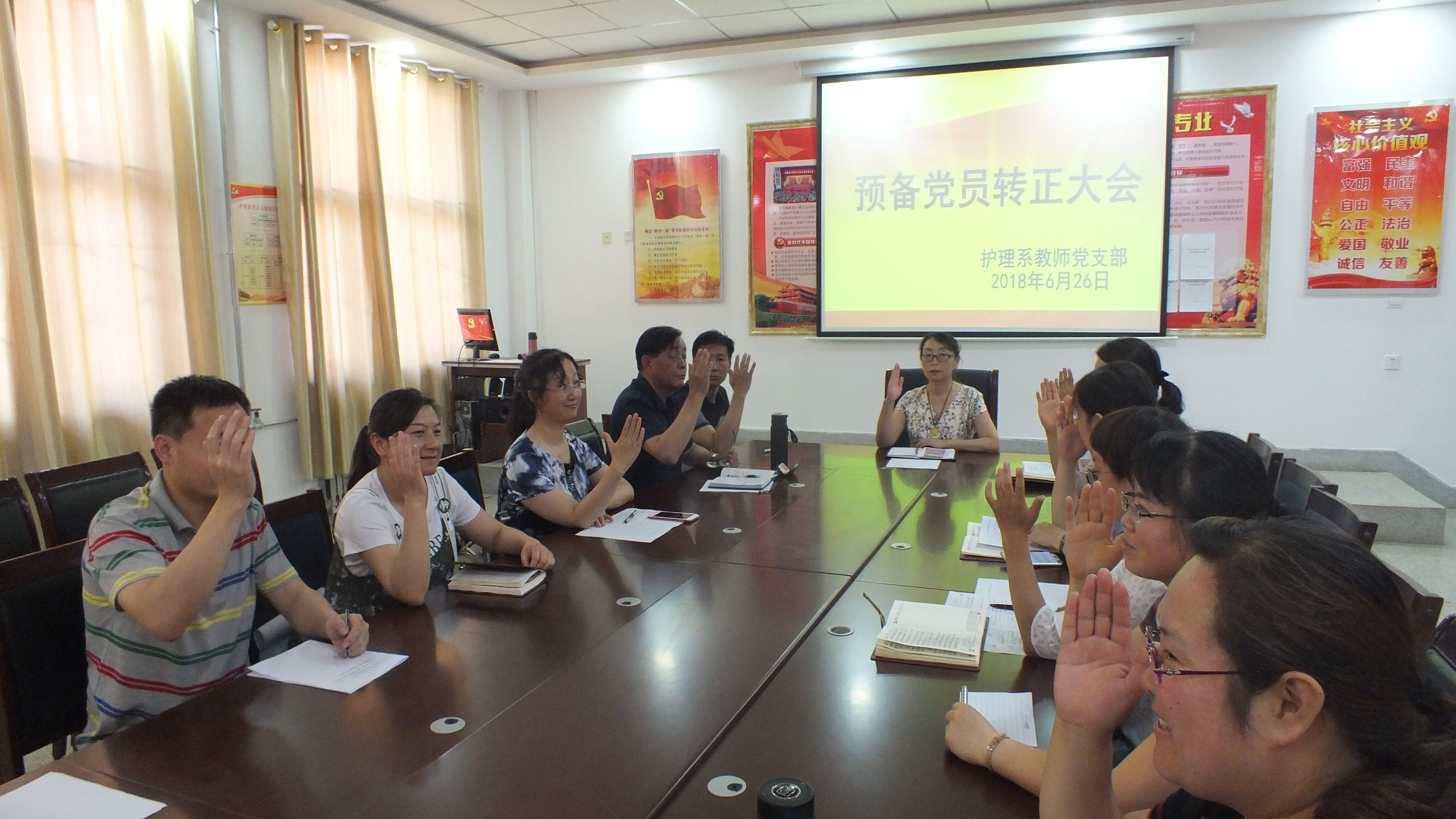 教師黨支部由護理系主任、支部書記韓曉萍主持。韓曉萍向在座黨員介紹了本次大會的主要內(nèi)容,按照轉正流程,預備黨員張前同志宣讀了轉正申請書,總結匯報了預備期間的思想認識、理論學習、工作生活情況。隨后,支部委員會和入黨介紹人分別介紹了對預備黨員同志的考察情況,認為該同志能夠主動學習黨的知識、工作認真負責、能夠自覺履行黨員義務,具備一名合格黨員的基本素質。其他參會黨員也發(fā)表了意見,希望他進一步加強學習,不斷提升自己,發(fā)揮黨員模范帶頭作用。