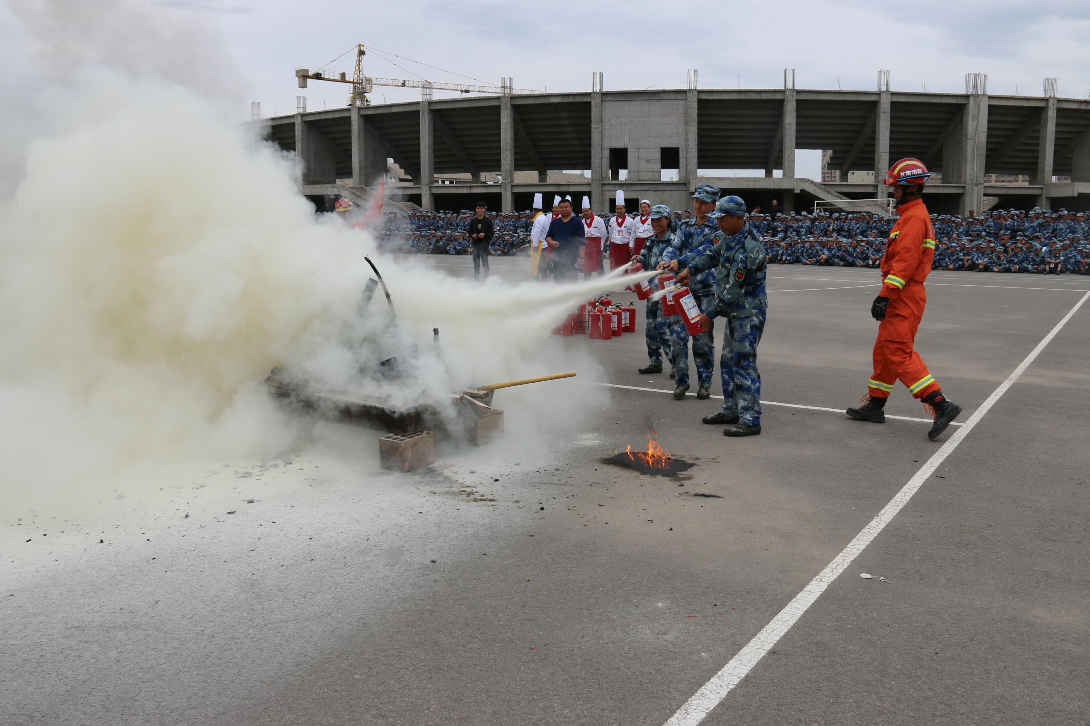 隨后,所有參演學(xué)生整隊到操場參加了滅火演練。在消防官兵的講解和和示范下,同學(xué)們體驗了處置著火液化氣瓶、干粉滅火器滅火、穿消防救生衣、通過模擬煙室等操作。