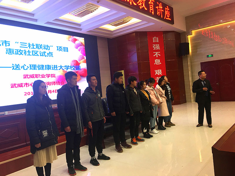 12月4日晚上,學(xué)生工作處聯(lián)合武威市“三社聯(lián)動”惠政社區(qū)試點(diǎn)項(xiàng)目在學(xué)院菁英廳舉辦了心理健康專題講座暨心理信息員培訓(xùn)。此次講座邀請武威市心理咨詢師協(xié)會會長何飛老師主講,學(xué)院各系輔導(dǎo)員、2017級、2018級班級心理信息員、心翼心理社團(tuán)會員等220多人聆聽了講座。學(xué)生工作處處長王守云主持活動。