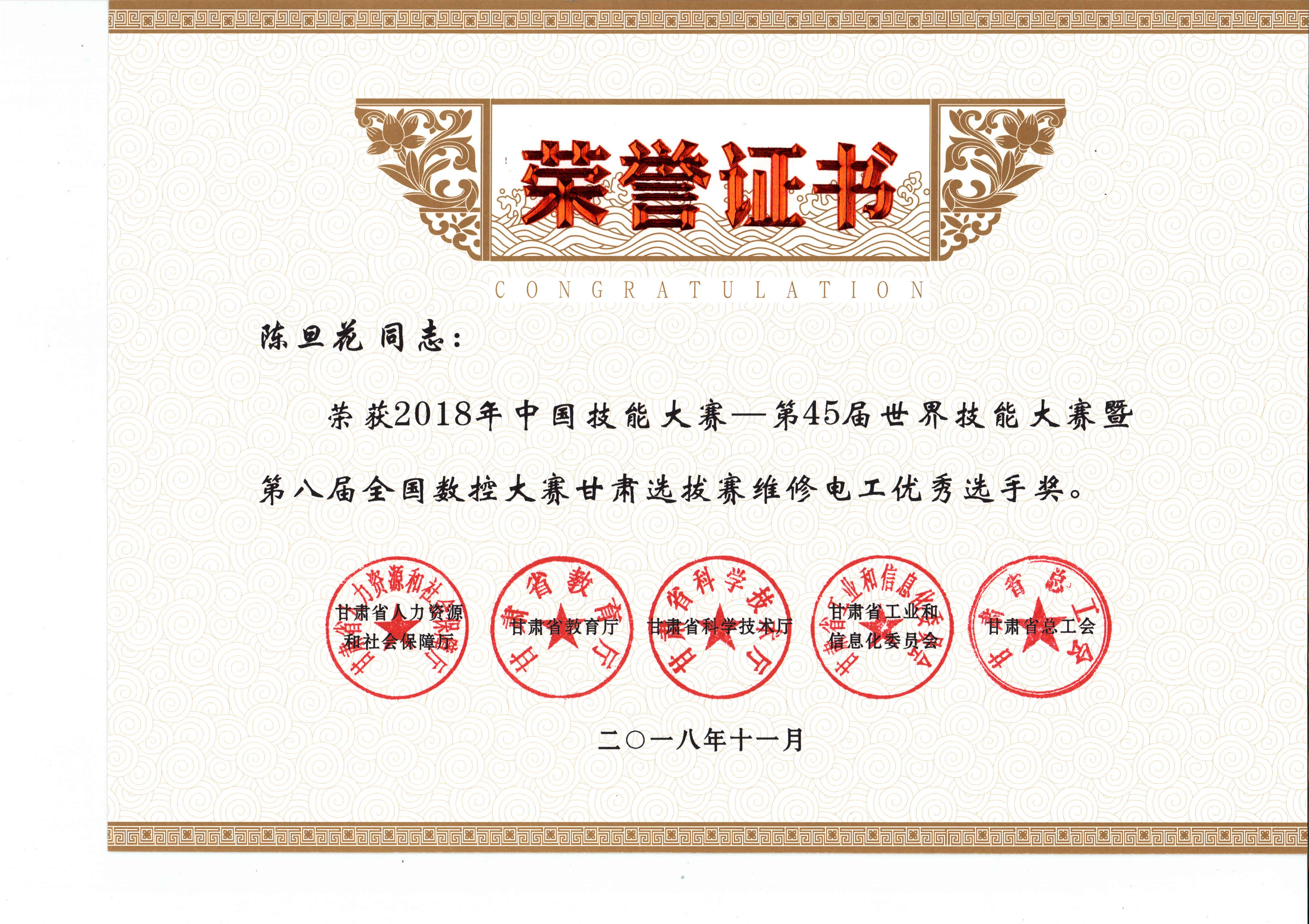 2018年中國技能大賽--第45屆世界技能大賽暨第八屆全國數(shù)控大賽甘肅選拔賽(維修電工項(xiàng)目)獲獎(jiǎng)證書