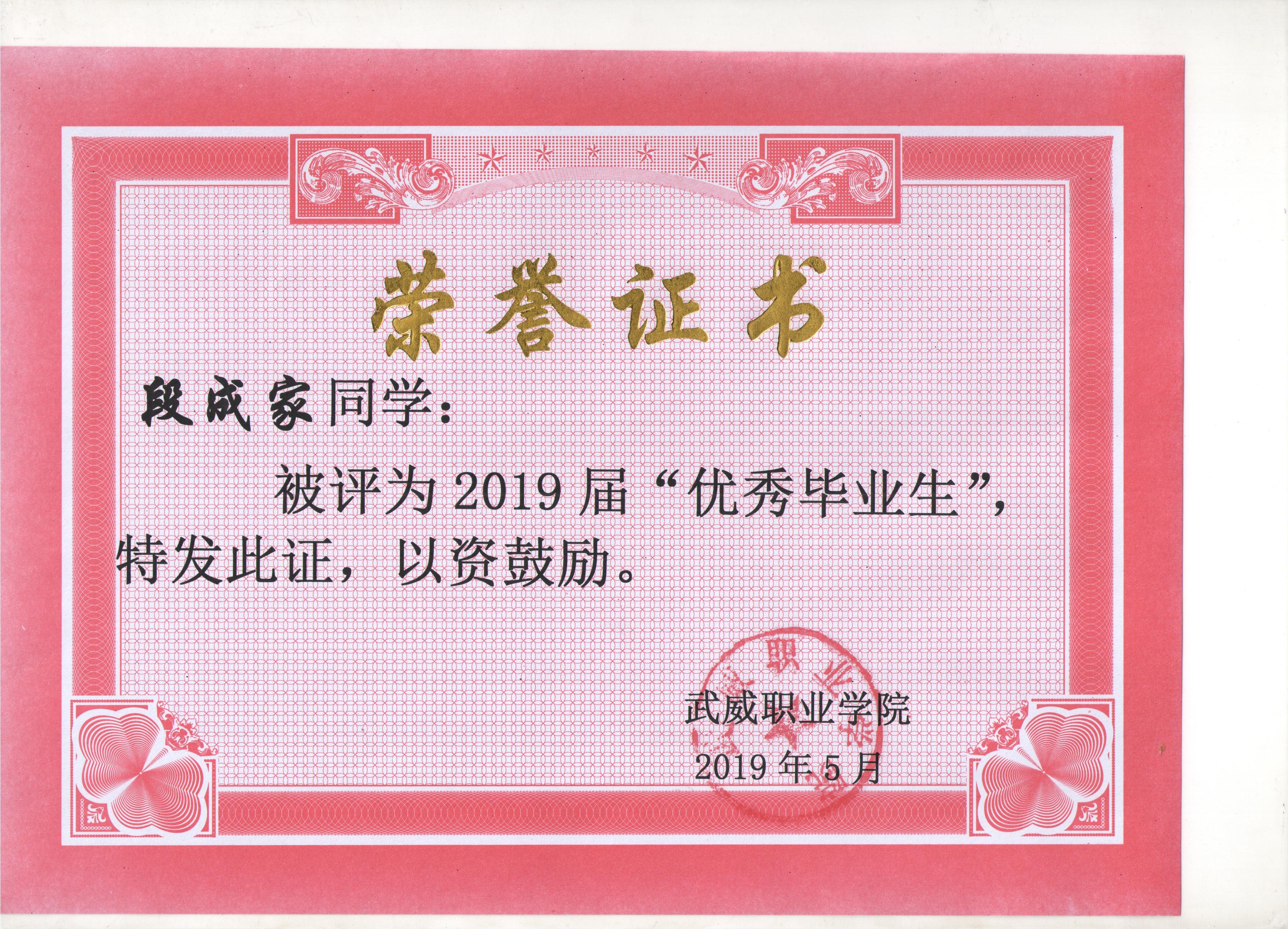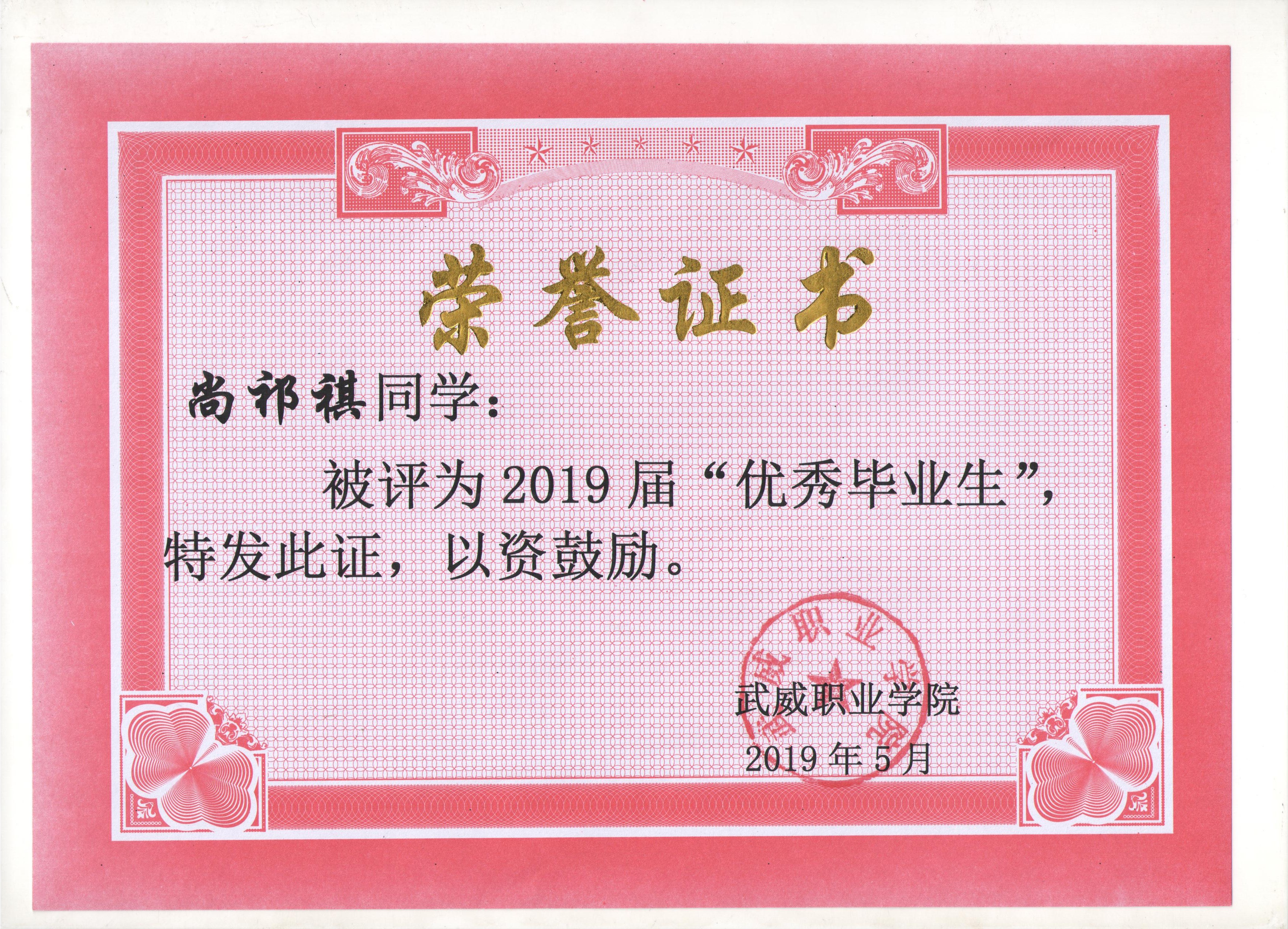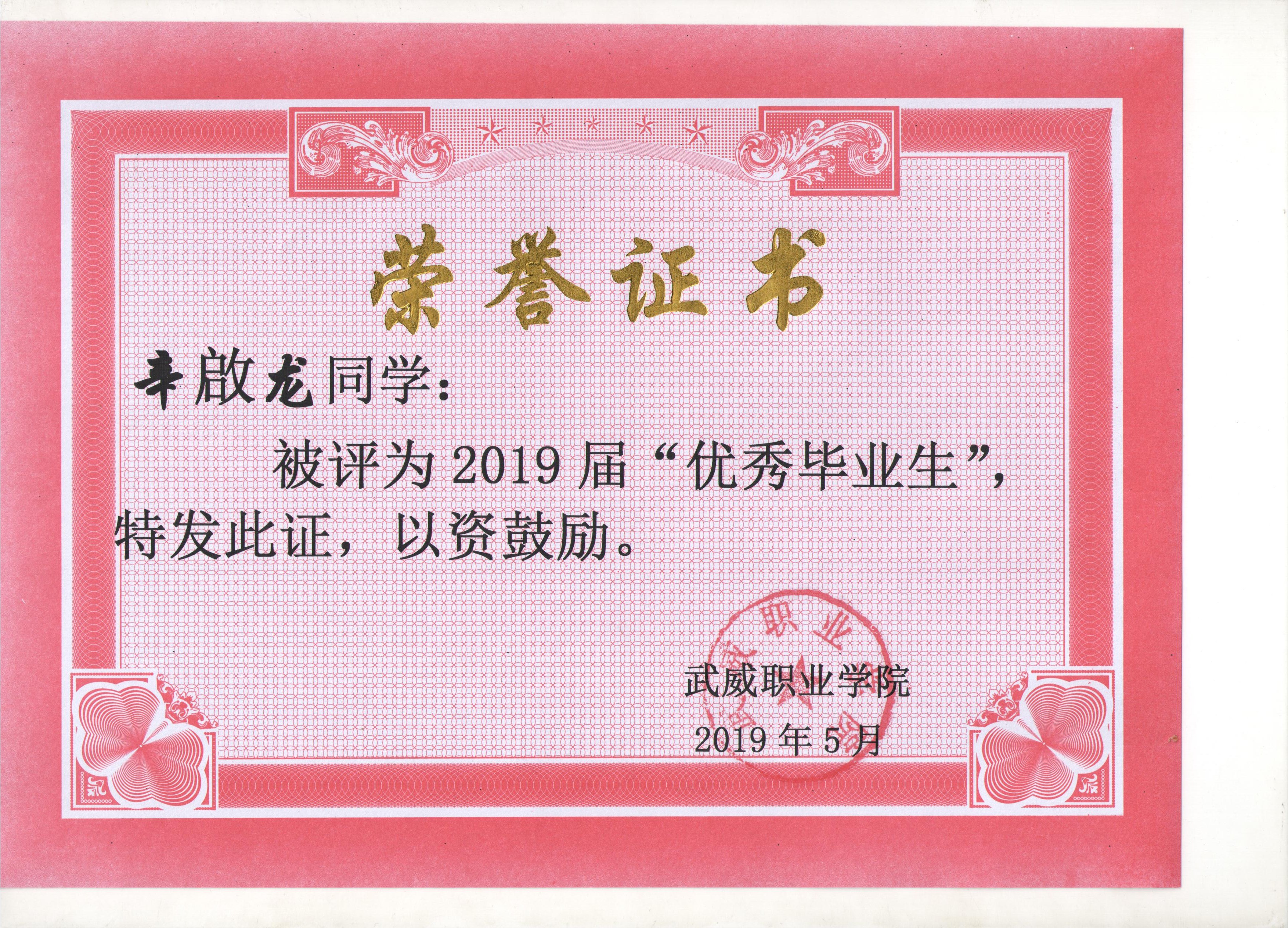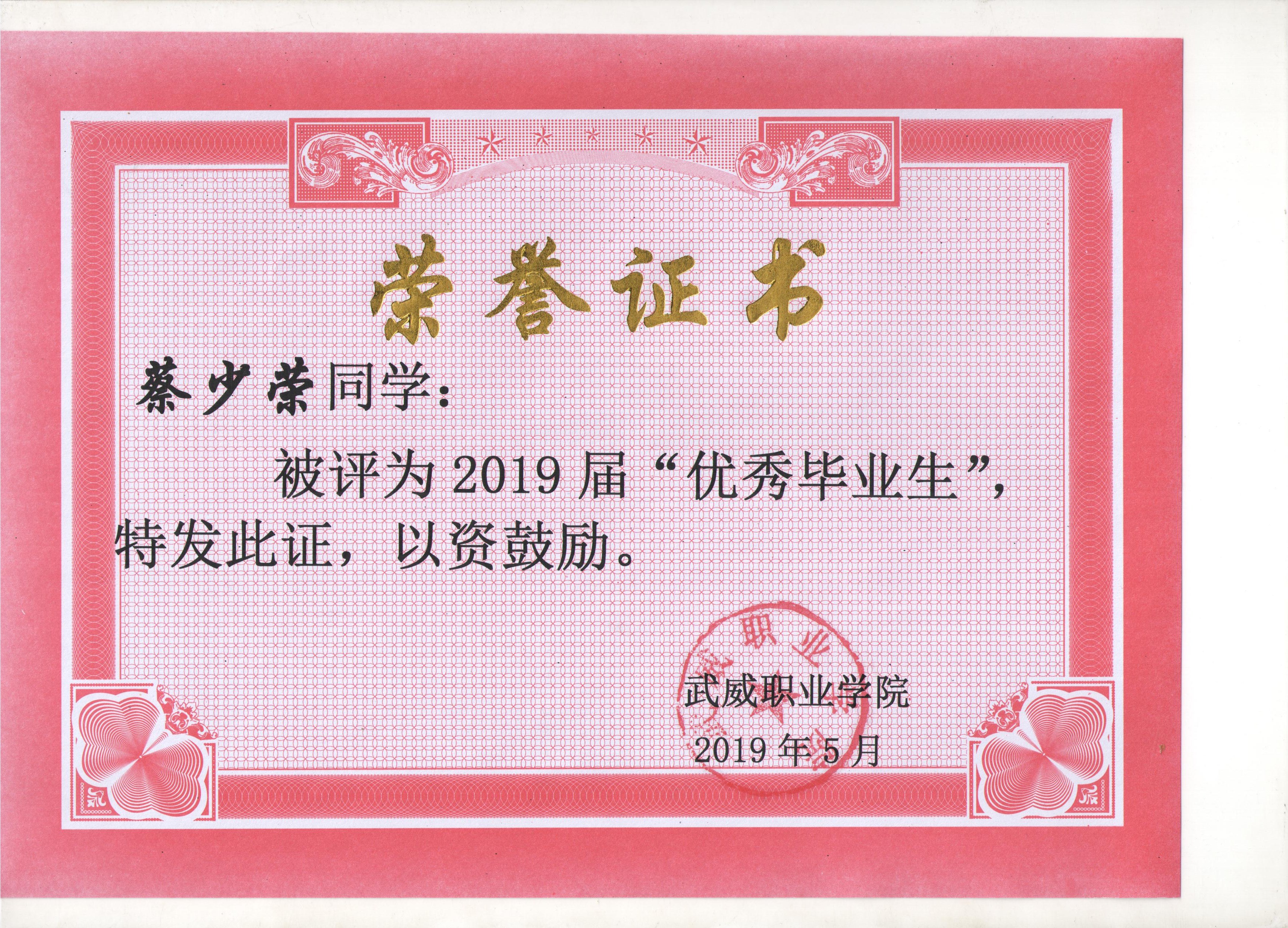 我系蔡少榮等19名同學(xué)榮獲武威職業(yè)學(xué)院2019屆“優(yōu)秀畢業(yè)生”榮譽稱號