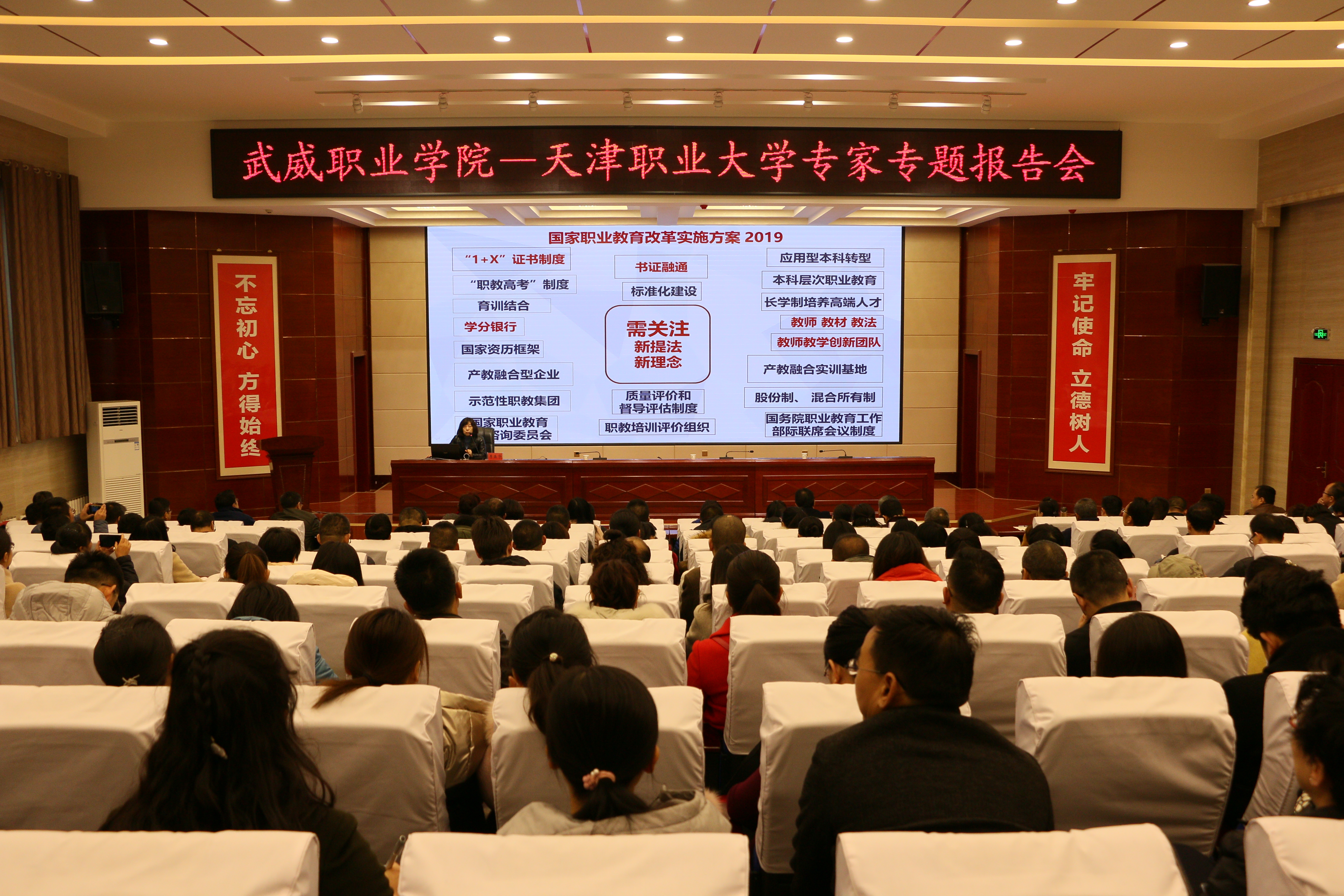 11月20日,武威職業(yè)學院“綠洲講壇”第27期在學院菁英廳舉行,本期活動邀請到天津職業(yè)大學汽車學院院長李晶華作主題為“《國家職業(yè)教育改革實施方案》解讀”的報告。學院領導班子、中層干部、教師代表220余人參加了報告會。本期講壇由學院黨委書記、院長趙明主持。