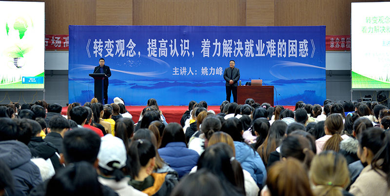 為貫徹2020屆全國(guó)普通高校畢業(yè)生就業(yè)創(chuàng)業(yè)工作網(wǎng)絡(luò)視頻會(huì)議精神,學(xué)院以習(xí)近平新時(shí)代中國(guó)特色社會(huì)主義思想為指導(dǎo),深入落實(shí)黨中央、國(guó)務(wù)院關(guān)于促進(jìn)高校畢業(yè)生就業(yè)創(chuàng)業(yè)的一系列重大決策部署,把畢業(yè)生就業(yè)工作擺在最突出位置,確保畢業(yè)生就業(yè)大局穩(wěn)定。12月14日上午,學(xué)院組織2020屆畢業(yè)生,在體育館參加了題為《轉(zhuǎn)變觀念,提高認(rèn)識(shí),著力解決就業(yè)難得困惑》的專家講座,引導(dǎo)畢業(yè)生轉(zhuǎn)變觀念、積極就業(yè)。講座由省人社廳人力資源市場(chǎng)檔案管理部部長(zhǎng)姚力峰主講,招生就業(yè)處副處長(zhǎng)董鵬主持。