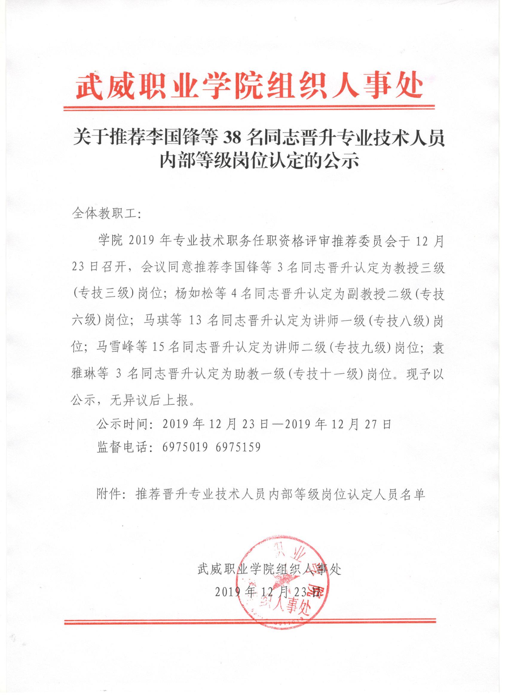 關(guān)于推薦李國(guó)鋒等38名同志晉升專(zhuān)業(yè)技術(shù)人員內(nèi)部等級(jí)崗位認(rèn)定的公示