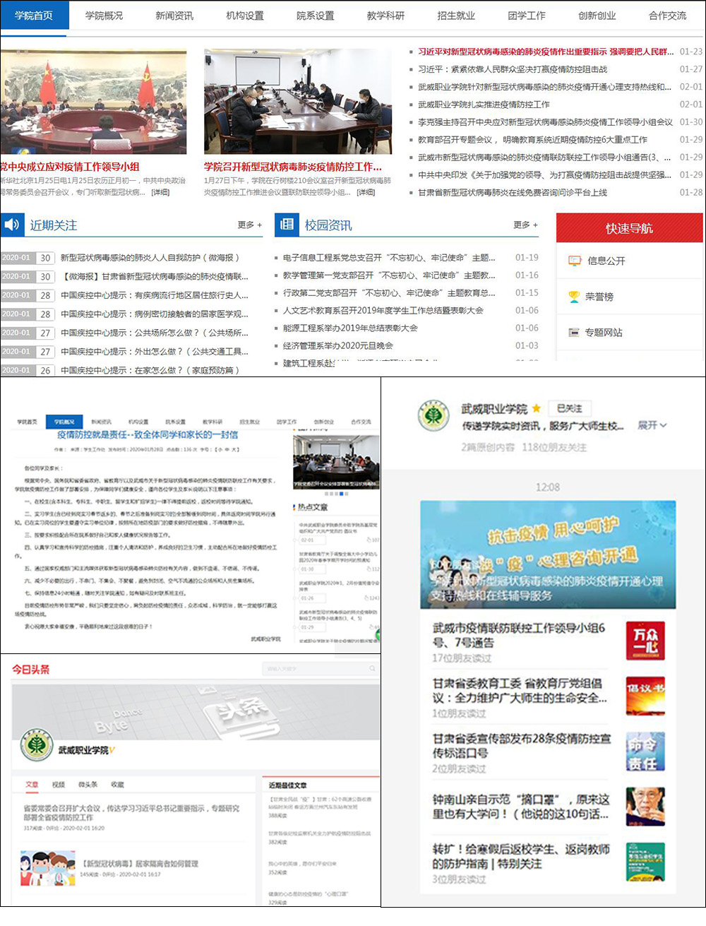 學院通過網(wǎng)站、微信公眾號、隴政釘、微信群、QQ群等平臺,第一時間刊載轉發(fā)習近平總書記重要指示、李克強總理批示,中共中央、教育部、省委、省教育工委、武威市委關于做好新型冠狀病毒感染肺炎疫情防控工作的重要會議、文件、通知以及《武威職業(yè)學院致全體同學和家長的一封信》《中共武威職業(yè)學院委員會致學院各基層黨組織和廣大共產(chǎn)黨員的倡議書》和防控知識50多條;做到宣傳教育和正面引導覆蓋到每一位教師、每一個班級、每一位學生,確保師生和學生家長及時了解疫情發(fā)展態(tài)勢、臨床癥狀和學習掌握防控知識;做到科學認識、理性判斷、合理應對,不信謠、不傳謠,養(yǎng)成健康的防控生活習慣,堅定信心、眾志成城防控疫情、戰(zhàn)勝疫情。