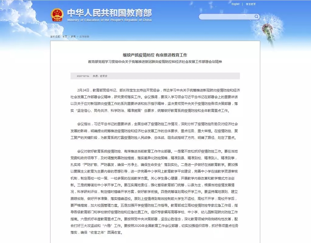 2月24日,教育部黨組書記、部長陳寶生主持召開黨組會,提出各地要以縣為主,根據(jù)當(dāng)?shù)匾咔榘l(fā)展情況,科學(xué)研判評估,制定中小學(xué)錯時錯峰開學(xué)方案,做好教學(xué)銜接。原則上疫情得到有效控制前大學(xué)生不返校、高校不開學(xué);高校開學(xué)后,要嚴(yán)格措施,加大校園管理力度。