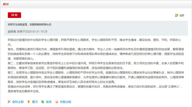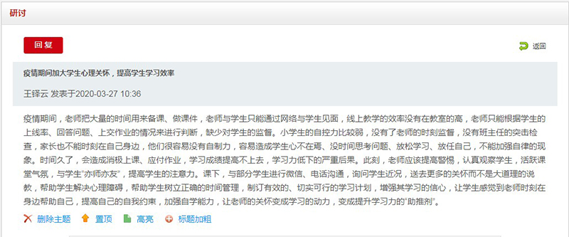 學(xué)生工作處教師姚斌表示,本次培訓(xùn)對輔導(dǎo)員角色定位及工作職責(zé)有了更深一步的認(rèn)知,對開展疫情防控工作、提升危機(jī)處理能力、守護(hù)學(xué)生身心健康起到指導(dǎo)作用,能幫助我們及時掌握特殊時期學(xué)生思想特點(diǎn)和行為特征,指導(dǎo)今后的工作。