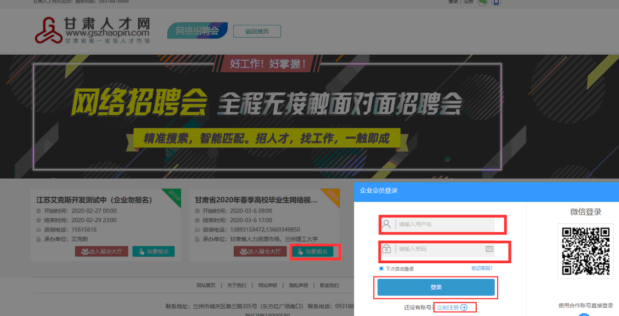 1.登錄甘肅人才網(wǎng)(www.gszhaopin.com),點擊菜單欄“招聘會”—“網(wǎng)絡招聘會”進入二級頁面菜單,進入網(wǎng)絡招聘會列表—選擇“武威職業(yè)學院2020屆醫(yī)藥衛(wèi)生類畢業(yè)生網(wǎng)絡視頻雙選會”點擊“我要報名”按鈕,登錄企業(yè)后臺(無賬號點擊“立即注冊”,資質通過審核后再報名),待定審核。