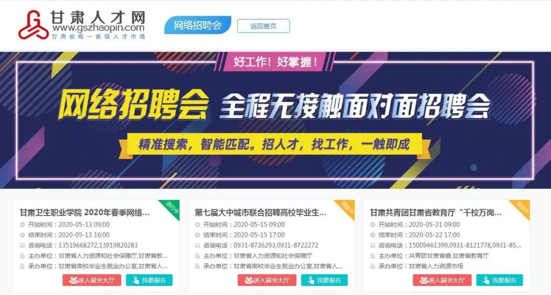 為應對新冠肺炎疫情沖擊,加大高校畢業(yè)生就業(yè)服務力度,進一步做好高校畢業(yè)生就業(yè)服務工作,甘肅省高校畢業(yè)生就業(yè)辦公室、甘肅省人力資源市場定于2020年5月15日聯(lián)合甘肅省內(nèi)部分高校在甘肅人才網(wǎng)(www.gszhaopin.com)舉辦“第七屆大中城市聯(lián)合招聘高校畢業(yè)生春季網(wǎng)絡視頻專場招聘會‘甘肅站’”活動。
