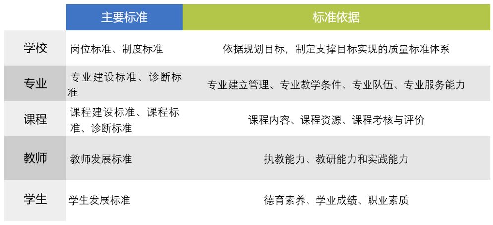 標(biāo)準(zhǔn)制定要體現(xiàn)多元質(zhì)量觀,采用剛性與柔性相結(jié)合的辦法,解決特色發(fā)展與創(chuàng)新發(fā)展的問題,堅(jiān)持“目標(biāo)導(dǎo)向與問題導(dǎo)向”的統(tǒng)一。從實(shí)際出發(fā),查找問題、研究問題、解決問題,重點(diǎn)解決學(xué)校內(nèi)部治理中存在的“透明管理”等突出問題;從專業(yè)建立管理、專業(yè)教學(xué)條件、專業(yè)隊(duì)伍、專業(yè)服務(wù)能力等維度制定專業(yè)建設(shè)標(biāo)準(zhǔn)和診斷標(biāo)準(zhǔn);從課程內(nèi)容、課程資源、課程考核與評(píng)價(jià)等維度制定課程建設(shè)標(biāo)準(zhǔn)、課程標(biāo)準(zhǔn)和課程診斷標(biāo)準(zhǔn);教師發(fā)展標(biāo)準(zhǔn)要以提升教師的執(zhí)教能力、教研能力和實(shí)踐能力為要素;學(xué)生發(fā)展標(biāo)準(zhǔn)要重點(diǎn)考慮學(xué)生的德育素養(yǎng)、學(xué)業(yè)成績、職業(yè)素質(zhì)。通過標(biāo)準(zhǔn)體系的打造,形成學(xué)校內(nèi)部質(zhì)量保證體系的標(biāo)準(zhǔn)鏈。