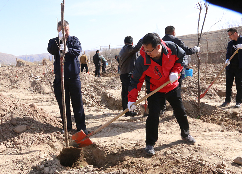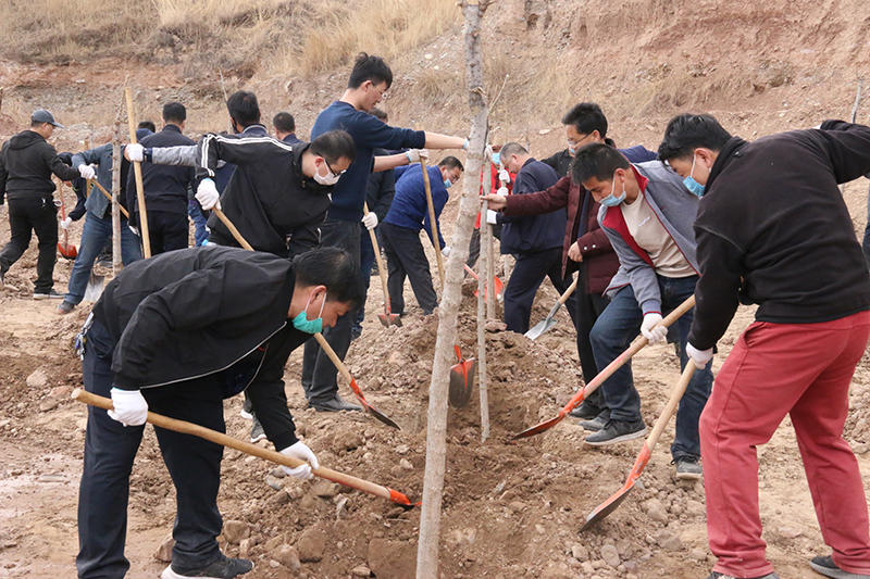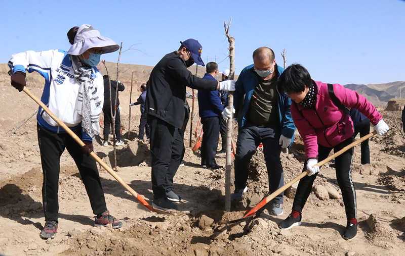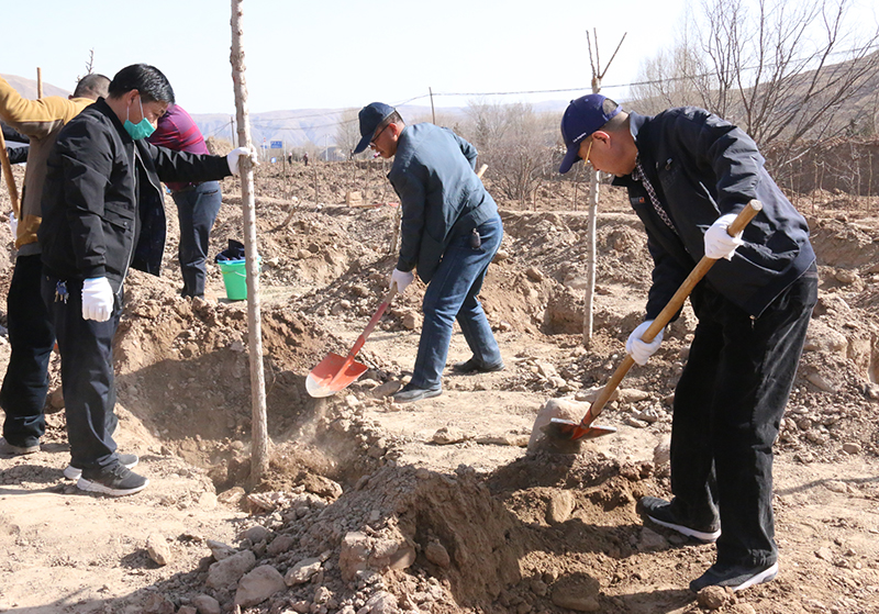 春風(fēng)吹拂處,新綠綻枝頭。為深入學(xué)習(xí)貫徹習(xí)近平總書記視察甘肅的重要講話和批示精神,認真踐行綠水青山就是金山銀山的發(fā)展理念,實施綠色發(fā)展戰(zhàn)略,進一步加強祁連山生態(tài)環(huán)境保護與治理,幫助幫扶鎮(zhèn)打贏脫貧攻堅戰(zhàn),實施鄉(xiāng)村振興戰(zhàn)略,4月9日,學(xué)院領(lǐng)導(dǎo)班子成員、幫扶干部、駐村干部及部分教職工70多人深入結(jié)對幫扶鎮(zhèn)——黑松驛鎮(zhèn)開展義務(wù)植樹活動,建設(shè)“生態(tài)示范林”。春光沐浴的祁連山腳下黑松驛鎮(zhèn),春意盎然,生機勃勃,正是植樹好時節(jié)。廣大教職工一下車就拿起鐵鍬到植樹現(xiàn)場,與黑松驛鎮(zhèn)政府部分干部一起投入植樹活動,按照“橫看直線側(cè)一線、三埋兩踩一提苗”的技術(shù)要求,三人一組,分工協(xié)作,有序配合,揮鍬培土、扶苖踩土、圍堰澆水,現(xiàn)場一派熱火朝天的勞動景象。當天植樹育林約20余畝,一棵棵新栽的樹苗整齊排列,迎風(fēng)挺立。通過義務(wù)植樹,廣大教職工用實際行動傳播著生態(tài)文明、綠色發(fā)展理念,切實幫助幫扶鎮(zhèn)綠起來,美起來,富起來。