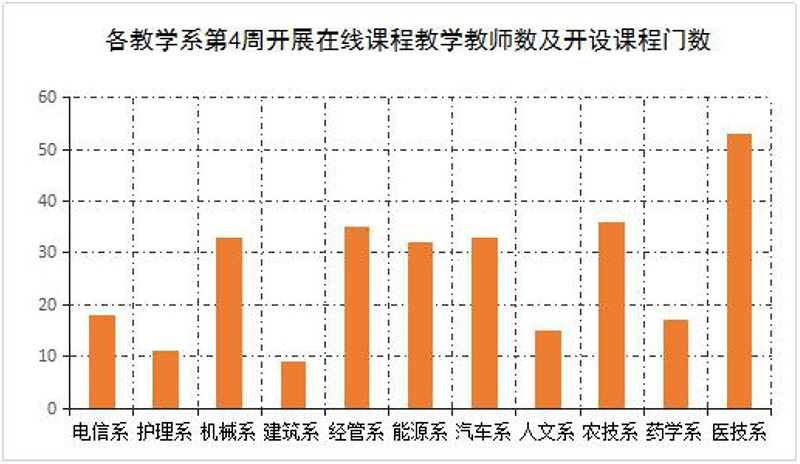 第4周,各教學系在線課程按照教學安排全部上線運行,實際開課315門,較第1-2周(284門次)有所增加。在線課程達到“應開盡開”的目標,全部在線課程整體運行平穩(wěn)有序。本周授課總學時達到1681學時,教師參加在線授課共計1631人次。
