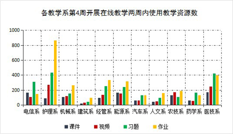 各教學系全面落實以學生為中心的教學理念,充分發(fā)揮班主任、任課教師、學生干部的監(jiān)督作用,提高在線教學成效。從各教學系整體統(tǒng)計數(shù)據(jù)看,第4周,教學資源學生訪問量達到了926633人次,學生到課127211人次,完成課后作業(yè)638次,上交學生40512人次。各門課程學習任務完成率普遍有所提高,大多數(shù)課程按照教學計劃進度學生學習完成率已全部達到100%。