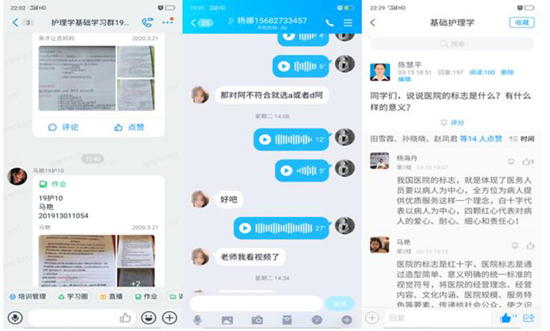 護理系通過“多平臺、多渠道”全面開展在線教學,主要采取“網(wǎng)絡課程+資料推送+討論答疑+互動直播”的線上教學模式。全系24名教師全部實施線上教學,課程共計11門次,已完成授課544學時(截至3月22日)。本周教師上傳課程課件93件,上傳視頻269個,根據(jù)教學任務布置課堂練習題數(shù)量為435,布置課后作業(yè)題目數(shù)量為857,本周內(nèi)教師組織開展討論、答疑的總次數(shù)為89次,學生參與答疑討論的次數(shù)為16874次。學生平均到課率95%以上。從學院教學平臺反饋數(shù)據(jù)看,本周課程訪問量達到399415,位居全院第一。
