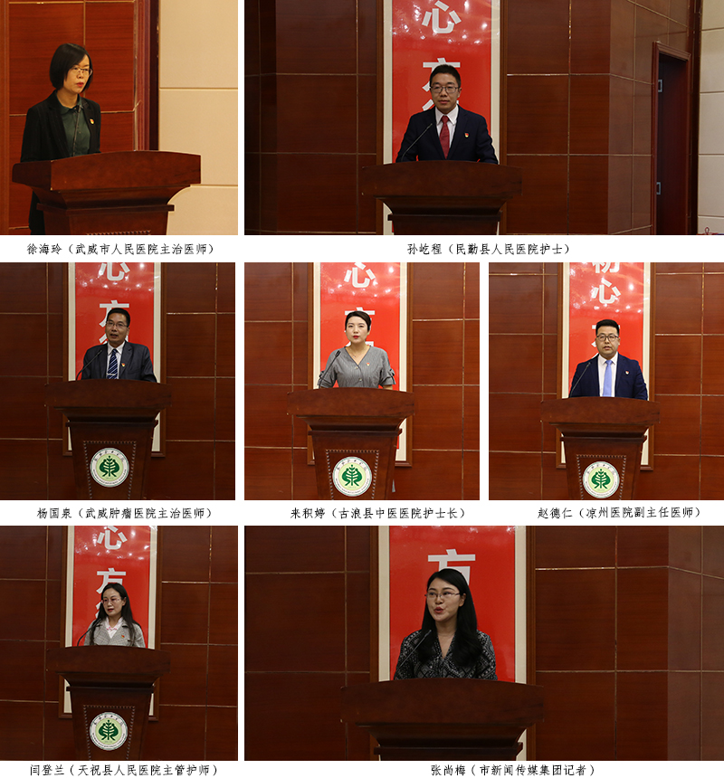 宣講報告團成員由6位援鄂優(yōu)秀隊員代表和市新聞傳媒集團的1位記者組成。宣講會上,武威市人民醫(yī)院主治醫(yī)師徐海玲、民勤縣人民醫(yī)院護士孫屹程、武威腫瘤醫(yī)院主治醫(yī)師楊國泉、古浪縣中醫(yī)醫(yī)院護士長來積婷、涼州醫(yī)院副主任醫(yī)師趙德仁、天??h人民醫(yī)院主管護師閆登蘭,市新聞傳媒集團記者張尚梅,用自己的親身經歷和樸實生動的語言,從主動請戰(zhàn)、逆行出征、克服困難、參與救治、關愛患者、勝利歸來等多個方面,滿懷深情地講述了他們在支援湖北期間的難忘瞬間與暖心經歷。他們用實際行動譜寫了一曲感天動地的英雄贊歌,生動詮釋了新時代武威精神,是武威人民的優(yōu)秀兒女,是當之無愧的“白衣戰(zhàn)士”、“最美逆行者”和“新時代最可愛的人”。會場不時響起如雷的掌聲。武威援鄂醫(yī)療隊全體成員以強烈的使命感和責任感,堅持奮戰(zhàn)在抗擊疫情的最前沿,展現了崇高的使命擔當,樹立了新時代的典型榜樣。