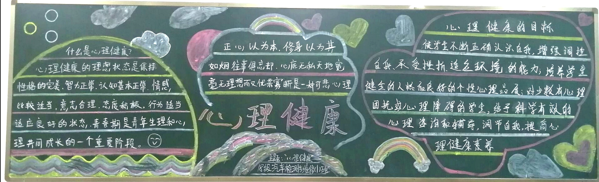 為進(jìn)一步提高大學(xué)生的心理素質(zhì),促進(jìn)大學(xué)生的身心健康和諧,宣傳普及心理健康知識(shí),深入開(kāi)展心理健康教育,我系結(jié)合學(xué)院特點(diǎn),突出專業(yè)優(yōu)勢(shì),在積極承擔(dān)和參與學(xué)校心理健康活動(dòng)月的團(tuán)日活動(dòng)的同時(shí),各班開(kāi)展了豐富多彩的以“心理健康”為主題的黑板報(bào)。