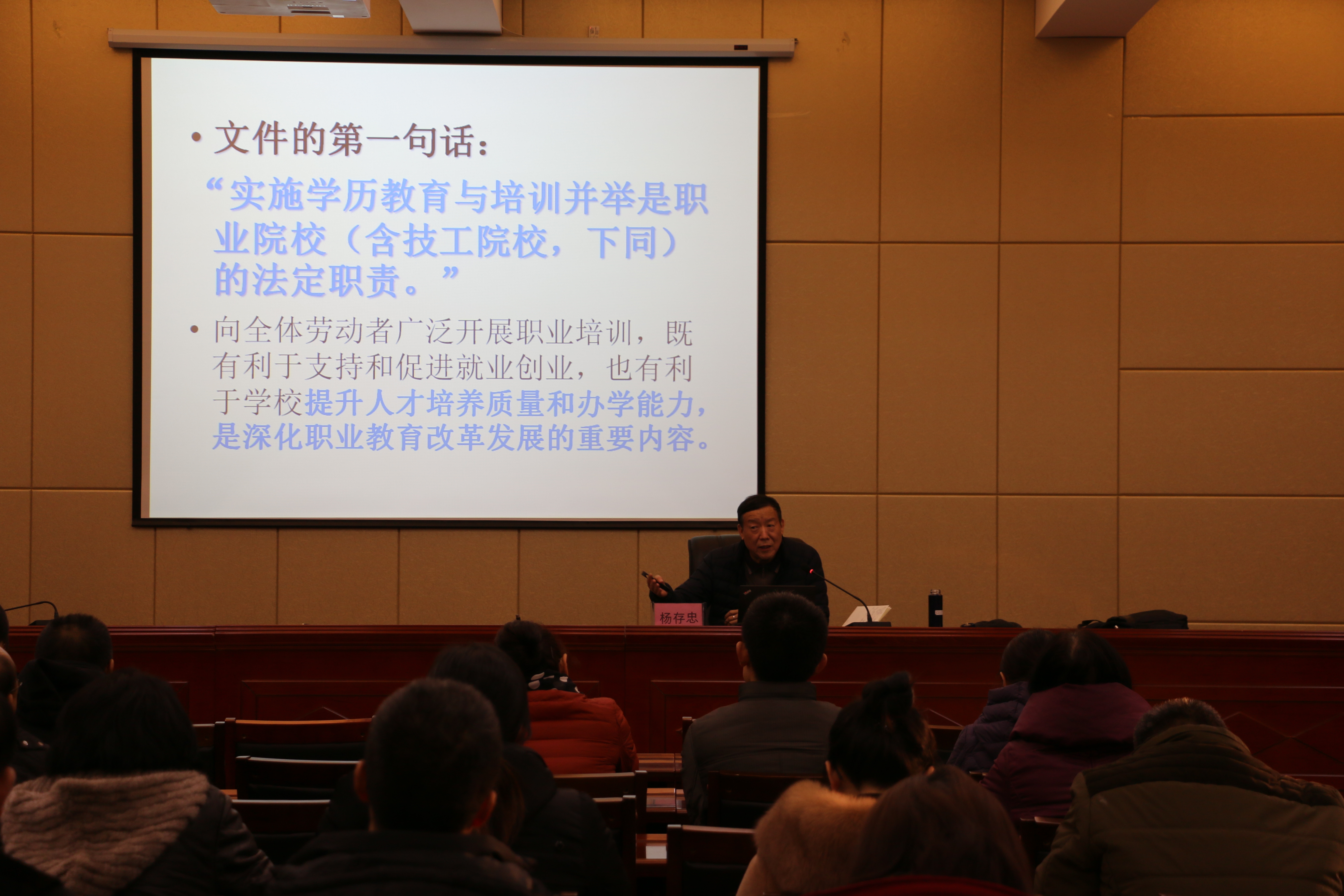 針對教育部11月25日發(fā)布的“關(guān)于做好《職業(yè)院校全面開展職業(yè)培訓(xùn) 促進就業(yè)創(chuàng)業(yè)行動計劃》實施工作有關(guān)事項的通知”的文件(以下簡稱《行動計劃》),楊教授從《行動計劃》出臺的背景和意義、職業(yè)院校的法定職責(zé)、職業(yè)院校普遍存在的問題、《行動計劃》對職業(yè)院校提出的重點任務(wù)和行動措施以及如何推進貫徹落實《行動計劃》等五個方面和大家進行了學(xué)習(xí)分享。楊教授強調(diào),深化職業(yè)教育改革發(fā)展,職業(yè)院校敞開校門,廣泛開展培訓(xùn)工作,服務(wù)社會發(fā)展,是職業(yè)院校的法定責(zé)任,也是學(xué)院可持續(xù)發(fā)展和生存的必然趨勢?!缎袆佑媱潯穼β殬I(yè)院校提出了十個方面的行動措施一是廣泛開展企業(yè)職工技能培訓(xùn)。二是積極開展面向重點人群的就業(yè)創(chuàng)業(yè)培訓(xùn)。三是大力開展失業(yè)人員再就業(yè)培訓(xùn)。四是做好職業(yè)指導(dǎo)和就業(yè)服務(wù)。五是推進培訓(xùn)資源建設(shè)和模式改革。六是加強培訓(xùn)師資隊伍建設(shè)。七是支持多方合作共建培訓(xùn)實訓(xùn)基地。八是完善職業(yè)院校開展培訓(xùn)的激勵政策。九是健全參訓(xùn)人員的支持鼓勵政策。十是建立培訓(xùn)評價與考核機制。楊教授希望大家能夠?qū)W好文件并認真思考學(xué)院的改革發(fā)展。把立德樹人、服務(wù)發(fā)展、促進就業(yè)、適應(yīng)需求的辦學(xué)理念傳承下去。