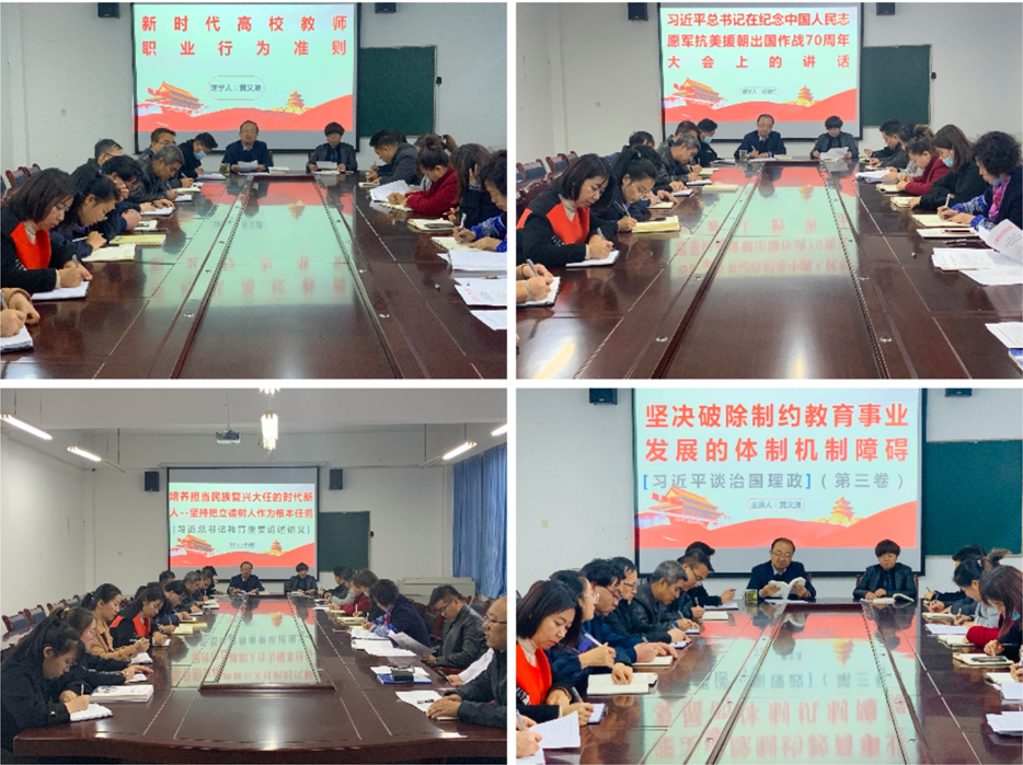 黃文源領(lǐng)學(xué)了《習(xí)近平談治國理政》(第三卷)第十二條 提高保障和改善民生水平——堅決破除制約教育事業(yè)發(fā)展的體質(zhì)機制障礙,解讀了《新時代高校教師職業(yè)行為十項準則》,要求所有教師要做以德立身、以德立學(xué)、以德施教、以德育德的楷模。楊如松領(lǐng)學(xué)了《習(xí)近平總書記教育重要論述講義》第二講 培養(yǎng)擔(dān)當民族復(fù)興大任的時代新人——堅持把立德樹人作為根本任務(wù)。楊建紅老師領(lǐng)學(xué)了習(xí)近平總書記在紀念中國 人民志愿軍抗美援朝出國作戰(zhàn)70周年大會的講話。