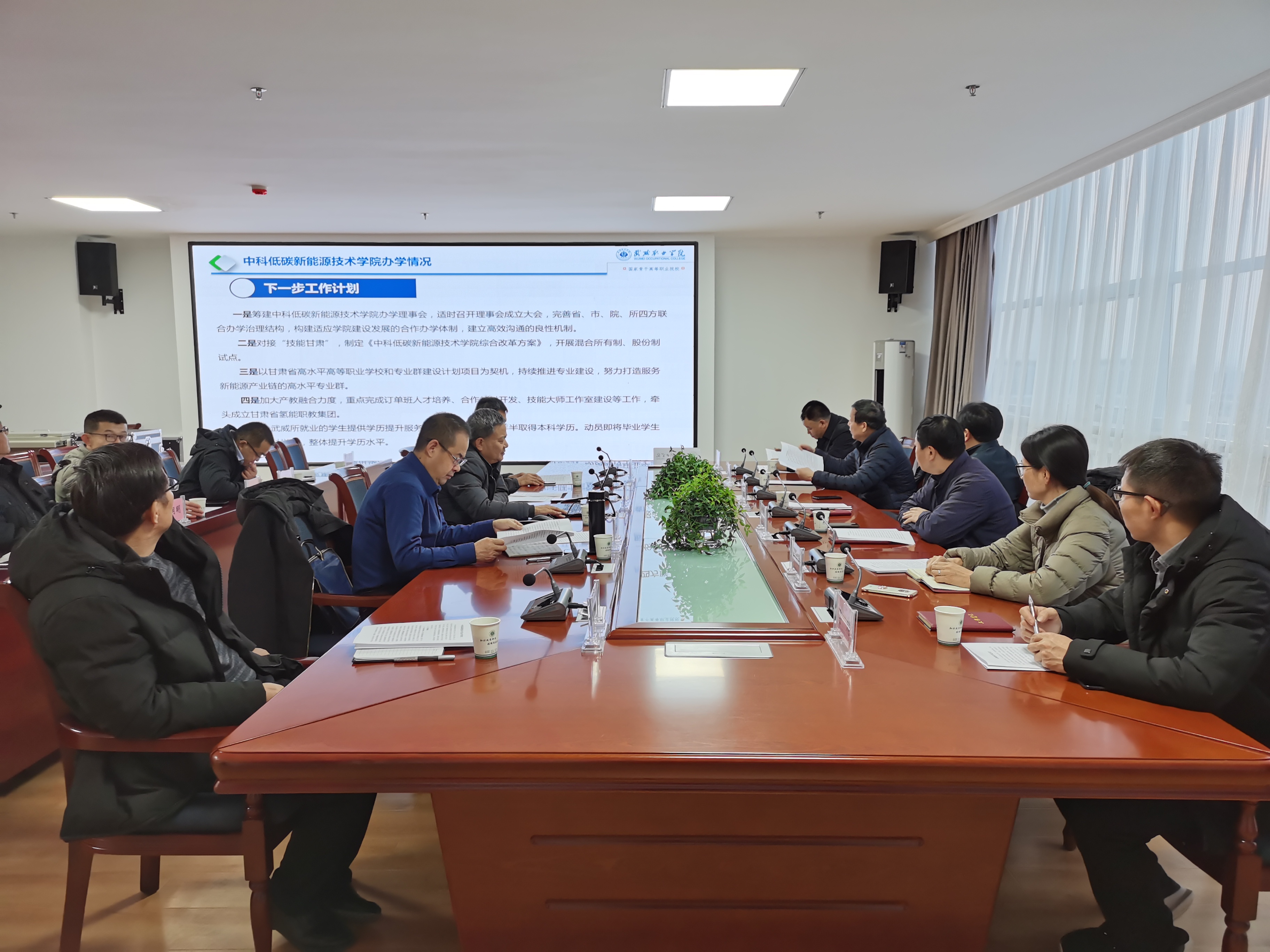 參觀結(jié)束后,學(xué)院在能源科技樓811會(huì)議召開了中科低碳新能源技術(shù)學(xué)院工作座談會(huì)。會(huì)上,趙明介紹了學(xué)院整合教學(xué)資源建設(shè)發(fā)展歷程、黨的建設(shè)、優(yōu)質(zhì)校建設(shè)、專業(yè)建設(shè)、合作辦學(xué)、師資隊(duì)伍建設(shè)、招生就業(yè)、科研服務(wù)、對(duì)外交流、校企合作和“雙高”院校創(chuàng)建等情況。重點(diǎn)就中科低碳新能源技術(shù)學(xué)院建設(shè)發(fā)展、專業(yè)申報(bào)、實(shí)驗(yàn)實(shí)訓(xùn)室建設(shè)、教育教學(xué)、人才培養(yǎng)和下一步工作計(jì)劃等情況進(jìn)行了詳細(xì)介紹。