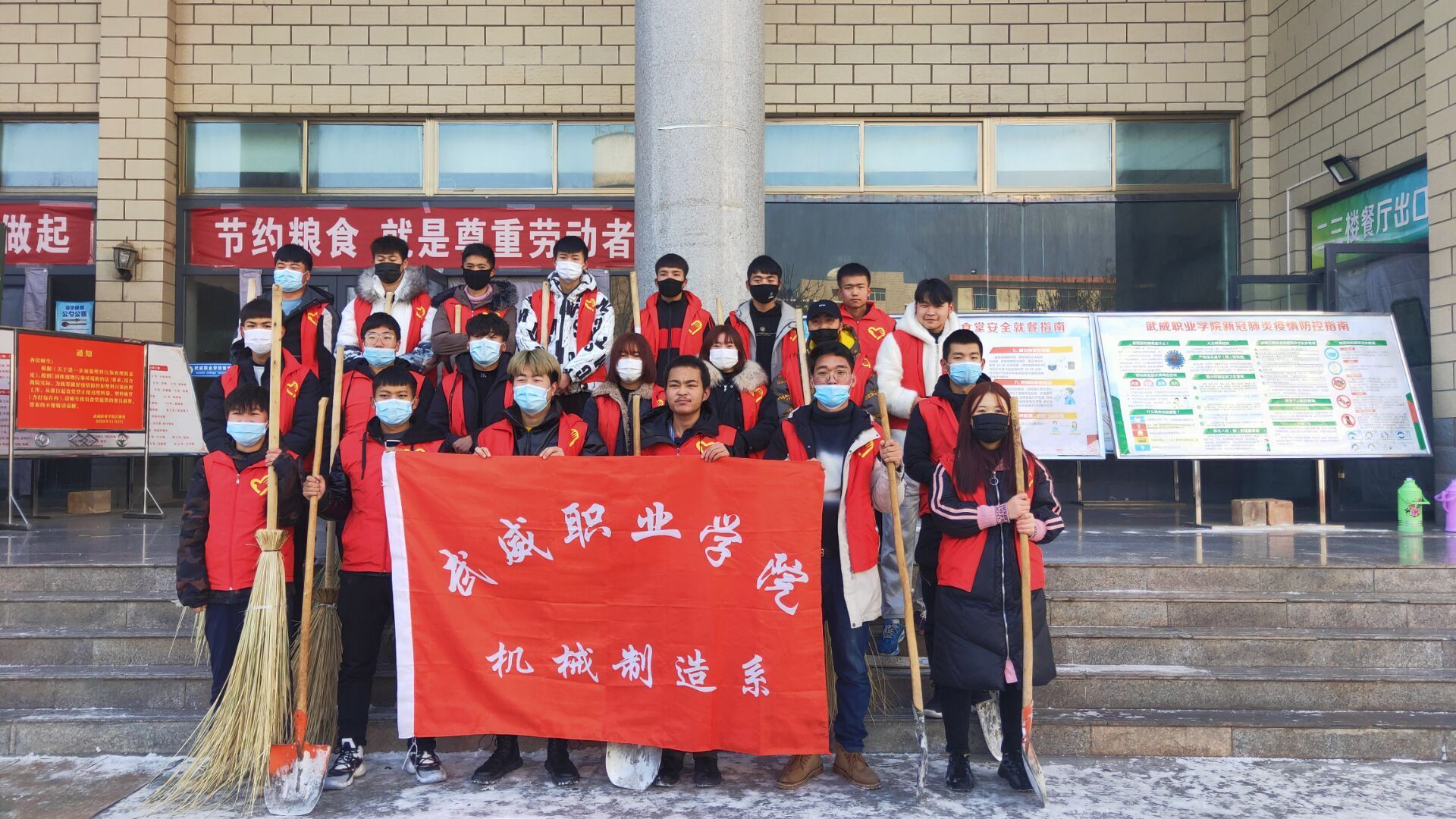 本次鏟雪的區(qū)域是教學(xué)樓區(qū)域的主干道和食堂門前道路。寒冷的天氣擋不住大家的勞動熱情,厚厚的冰塊蓋不住大家的志愿精神。鐵鍬聲此起彼伏,大家分工明確,相互合作,現(xiàn)場氣氛熱烈。經(jīng)過多小時的勞動,大家將教學(xué)樓前主干道積雪基本清掃干凈。