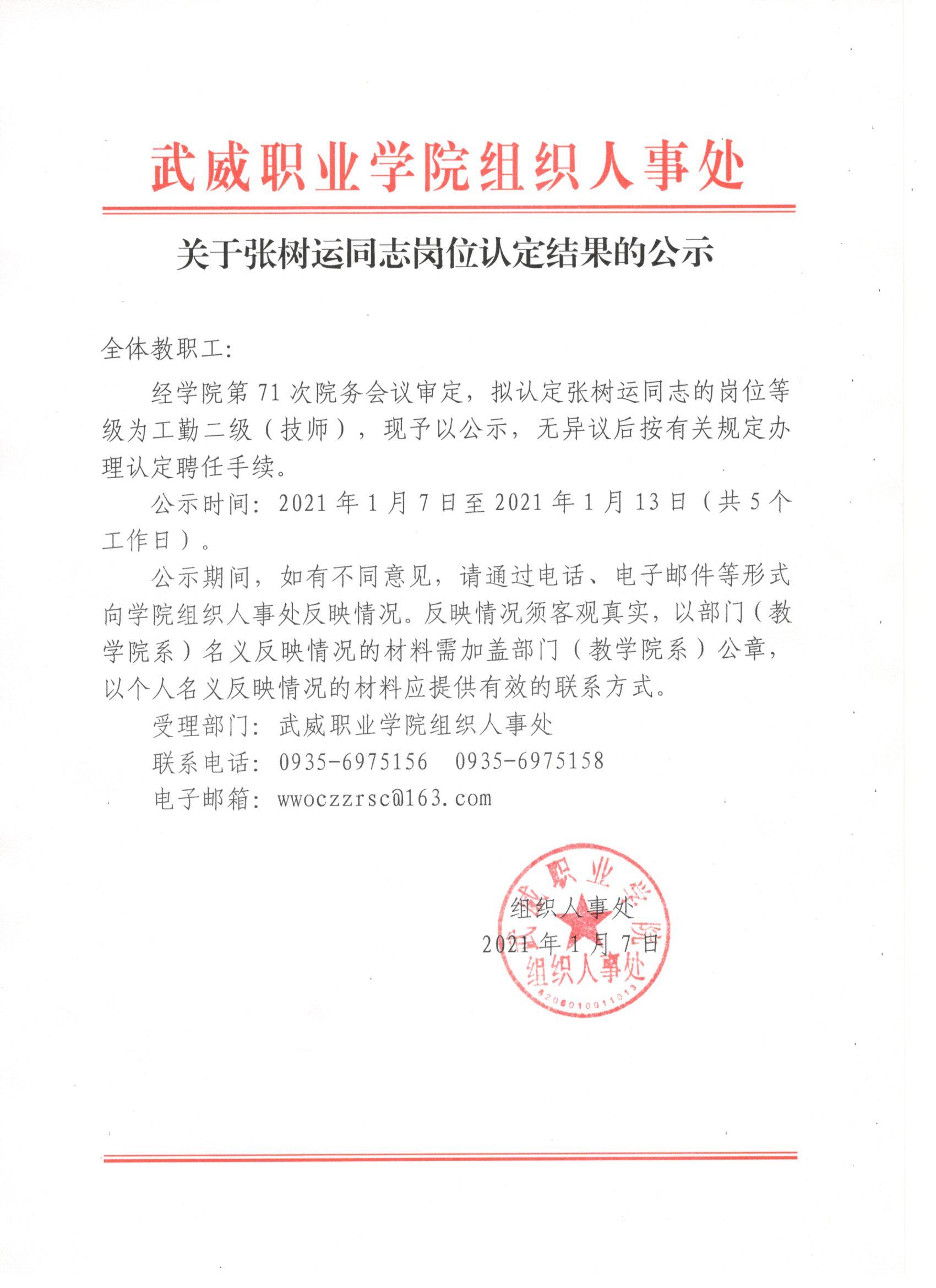 關(guān)于張樹(shù)運(yùn)同志崗位認(rèn)定結(jié)果的公示