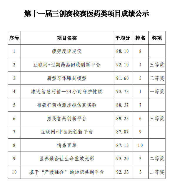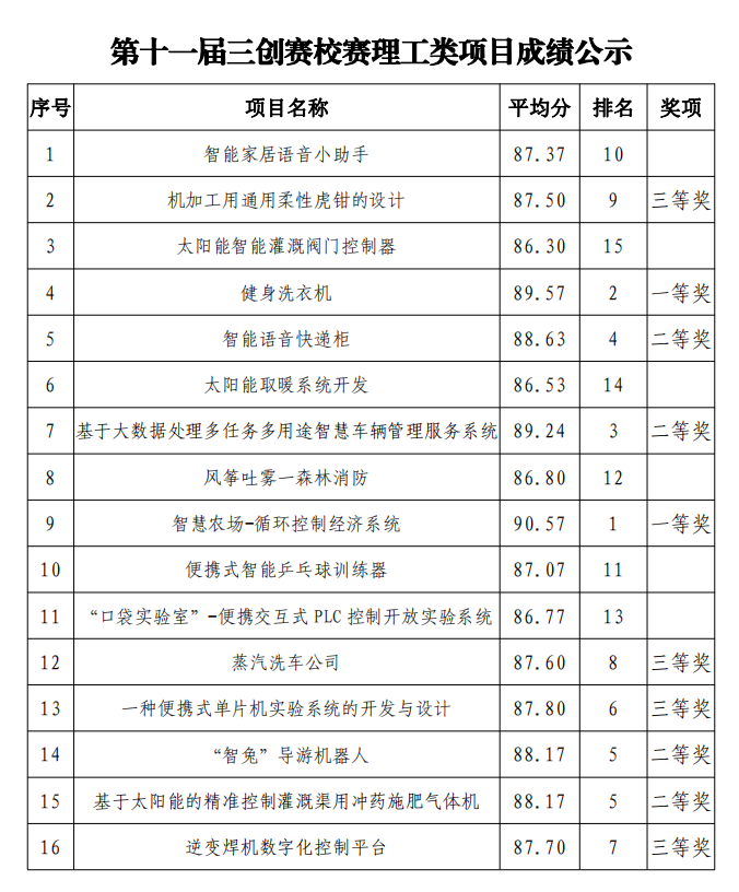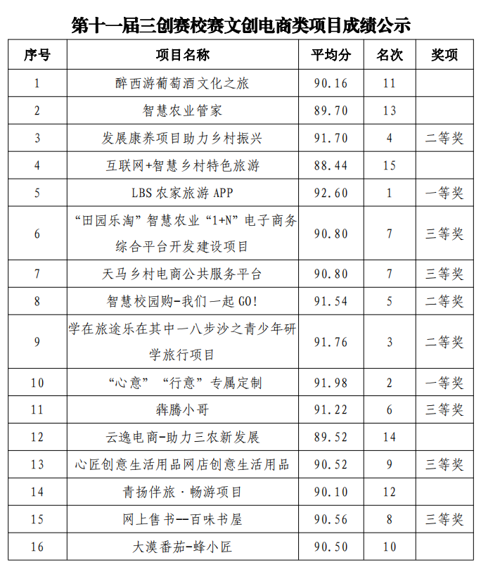 按照第十一屆三創(chuàng)賽省賽組委會要求,學院于4月24日在創(chuàng)新創(chuàng)業(yè)中心舉辦了校賽,經(jīng)學生團隊申報、現(xiàn)場答辯及專家評審環(huán)節(jié),校賽已圓滿完成。按照校賽方案,一等獎不超過參賽隊數(shù)的 10%,二等獎不超過參賽隊數(shù)的 20%,三等獎不超過參賽隊數(shù)的 30%?,F(xiàn)將第十一屆三創(chuàng)賽校賽獲獎項目成績和獲獎名次予以公示,公示期三日。