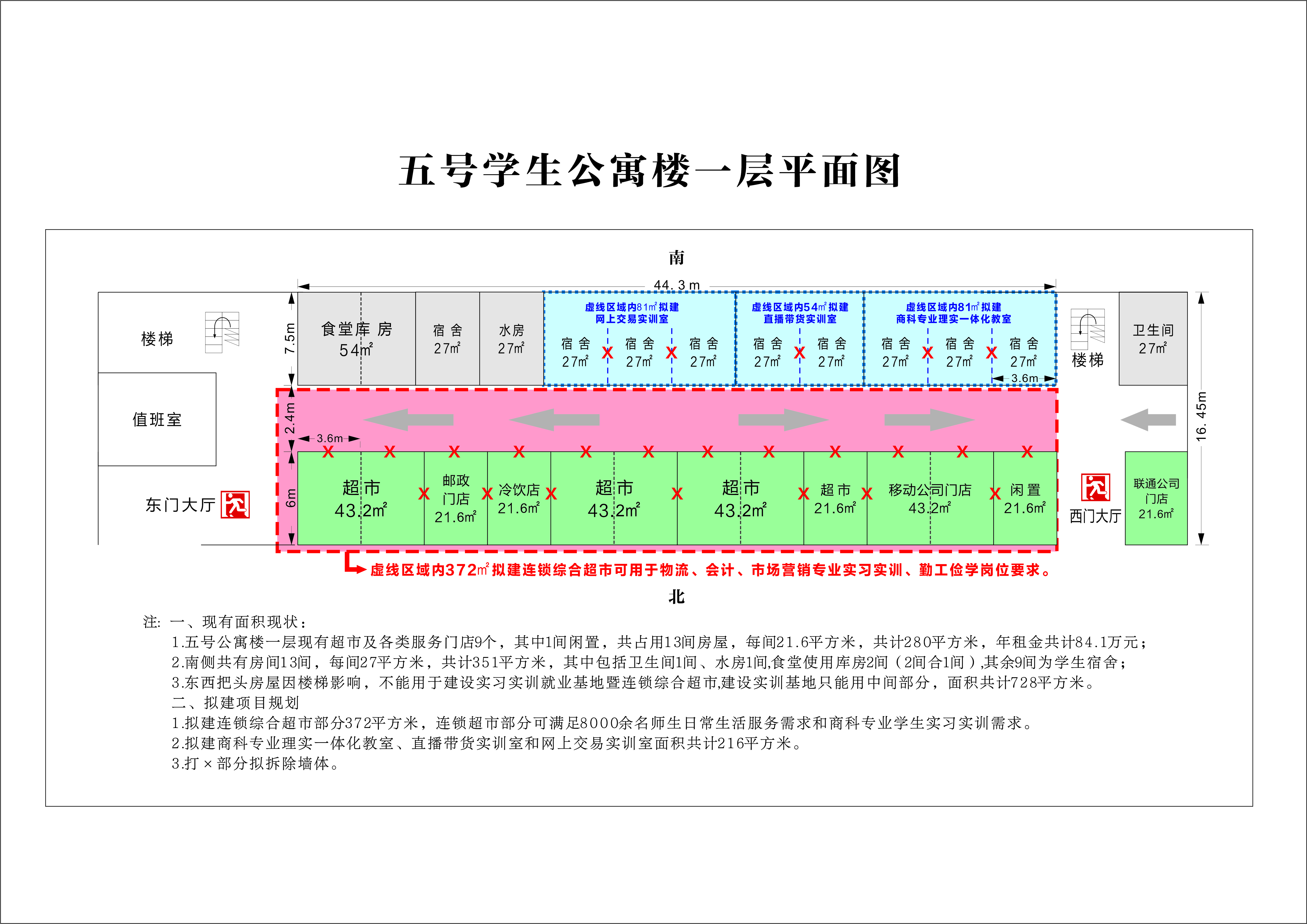 4.學(xué)院提供五號(hào)學(xué)生公寓樓一層面積共計(jì)728平方米場(chǎng)地用于建設(shè)學(xué)院商科專(zhuān)業(yè)所需產(chǎn)教融合實(shí)習(xí)實(shí)訓(xùn)就業(yè)基地暨連鎖綜合超市,其中,216平方米用于建設(shè)商科專(zhuān)業(yè)理實(shí)一體化教室、直播帶貨實(shí)訓(xùn)室和網(wǎng)上交易實(shí)訓(xùn)室;372平方米(原商鋪面積為259平方米,增加113平方米為樓道走廊)用于建設(shè)連鎖綜合超市及實(shí)訓(xùn)場(chǎng)所,滿(mǎn)足師生日常生活需求和商科專(zhuān)業(yè)學(xué)生頂崗實(shí)習(xí)、實(shí)訓(xùn)、勤工儉學(xué)等(改建方案詳見(jiàn)附后平面圖)。建設(shè)所需手續(xù)由學(xué)院和企業(yè)雙方配合完成辦理。