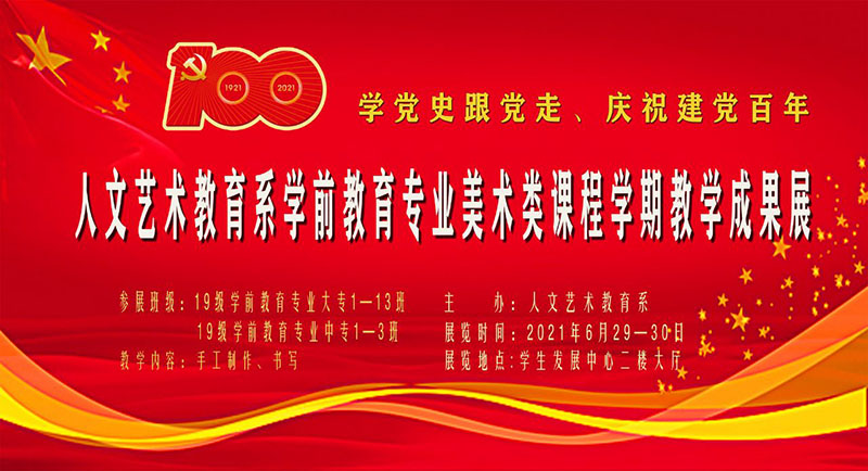 6月29日—30日人文藝術(shù)教育系在大學(xué)生發(fā)展中心二樓菁英廳大廳舉辦“學(xué)黨史跟黨走”、“慶祝建黨百年”為主題的學(xué)前教育專業(yè)美術(shù)類課程學(xué)期教學(xué)成果展。