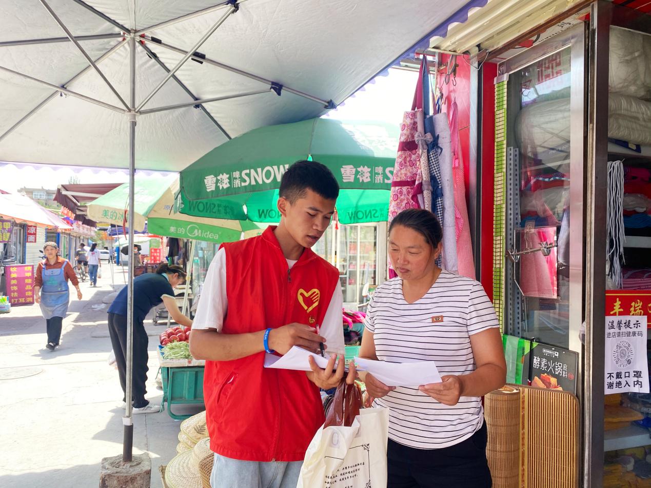 圖為實(shí)踐隊(duì)員在涼州區(qū)武南鎮(zhèn)為商戶(hù)發(fā)放推普資料