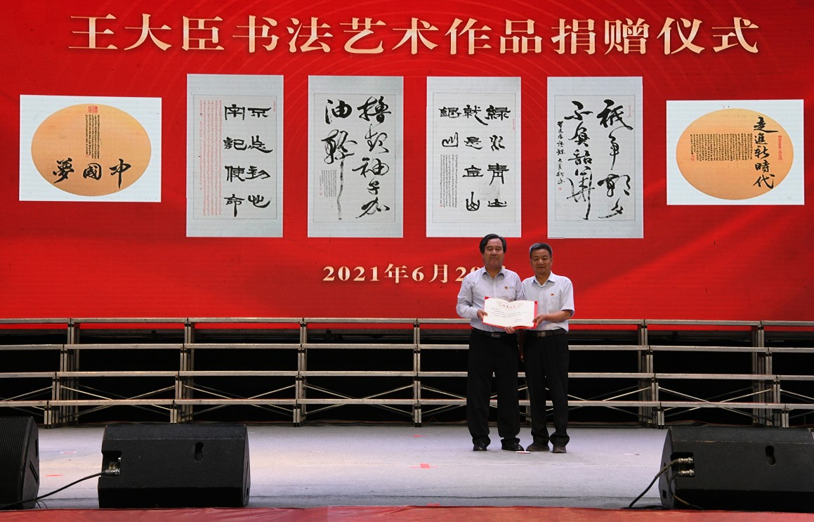 之后舉行了王大臣先生書法藝術(shù)作品捐贈儀式,學院黨委書記、院長趙明教授為王大臣先生頒發(fā)《收藏證書》。王大臣先生自愿將140多件書法藝術(shù)作品無償捐贈給我們學院,給我們留下了寶貴的精神財富,讓作品中蘊含的紅色基因薪火相傳、血脈永續(xù)!