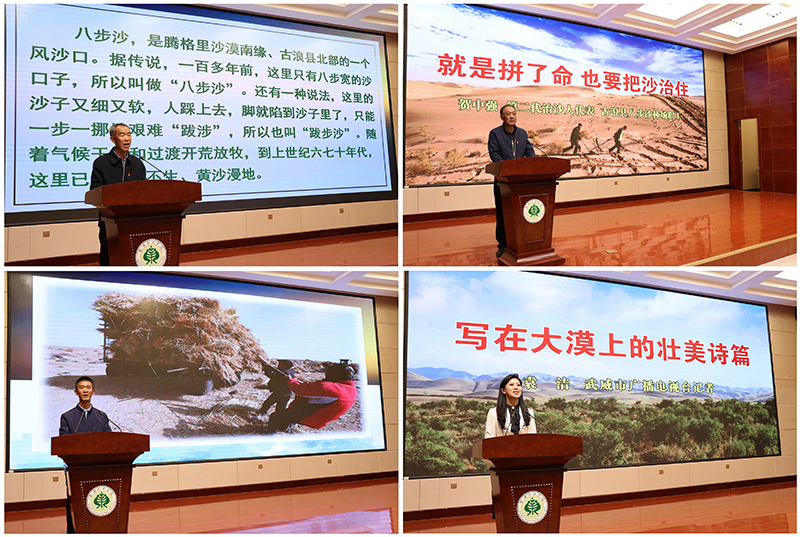 報告會上,二代治沙人代表、八步沙林場場長郭萬剛,二代治沙人代表、八步沙林場職工賀中強,三代治沙人、八步沙林場管護員郭璽、武威市廣播電視臺記者袁潔,分別從綠色承諾、使命責任、接續(xù)奮斗、記者見證等不同角度、不同側(cè)面,生動再現(xiàn)了“六老漢”三代人治沙造林持續(xù)改善生態(tài)環(huán)境、讓沙漠披綠生金的感人事跡。在場師生無不為“六老漢”三代人的感人事跡深深震撼,紛紛表示要學習和繼承“六老漢”三代人困難面前不低頭、敢把沙漠變綠洲的奮斗精神,為建設美麗中國、實現(xiàn)中華民族永續(xù)發(fā)展貢獻自己的青春力量。