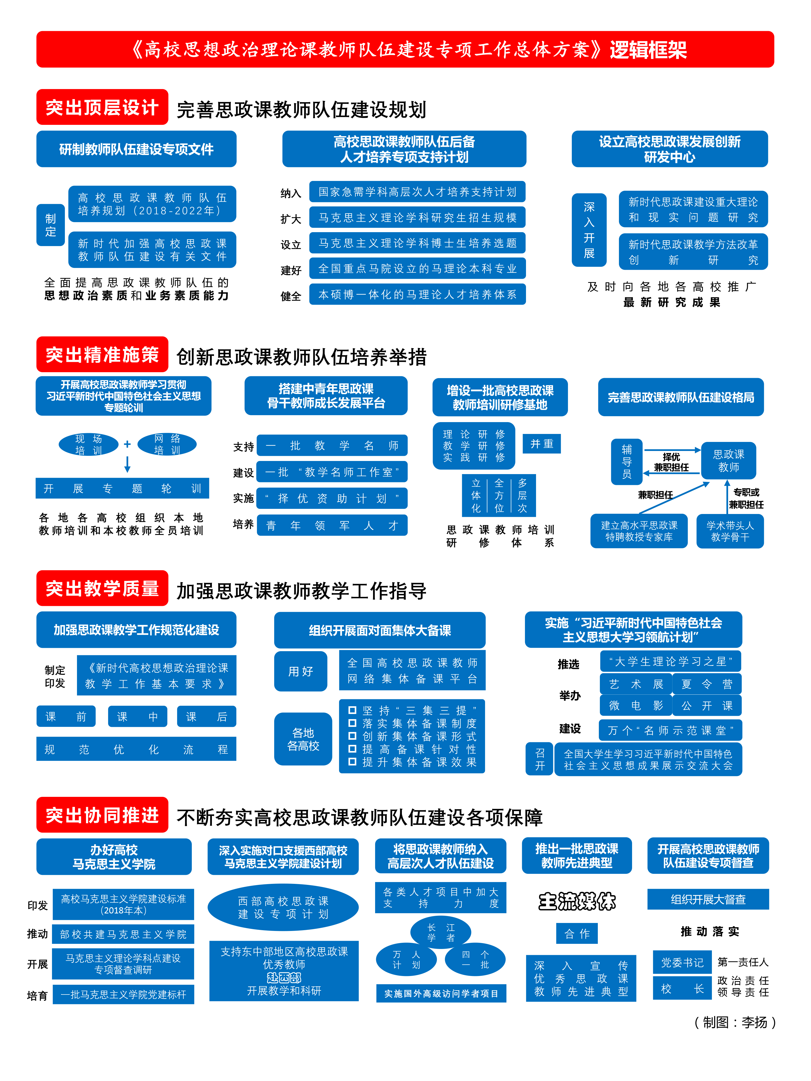 《方案》要求突出協(xié)同推進(jìn),不斷夯實(shí)高校思政課教師隊(duì)伍建設(shè)各項(xiàng)保障。深入推動(dòng)部校共建馬克思主義學(xué)院,培育一批高校馬克思主義學(xué)院黨建標(biāo)桿、思政課教師先進(jìn)黨支部,實(shí)施對(duì)口支援西部高校馬克思主義學(xué)院建設(shè)計(jì)劃,支持西部12省(區(qū)、市)和新疆生產(chǎn)建設(shè)兵團(tuán)思政課建設(shè),在“長(zhǎng)江學(xué)者獎(jiǎng)勵(lì)計(jì)劃”“萬人計(jì)劃”“四個(gè)一批”人才等項(xiàng)目中加大對(duì)高校思政課教師隊(duì)伍的支持力度,深入宣傳優(yōu)秀思政課教師先進(jìn)典型,開展高校思政課教師隊(duì)伍建設(shè)專項(xiàng)督查,切實(shí)把思政課教師隊(duì)伍建設(shè)的各項(xiàng)要求落到實(shí)處。