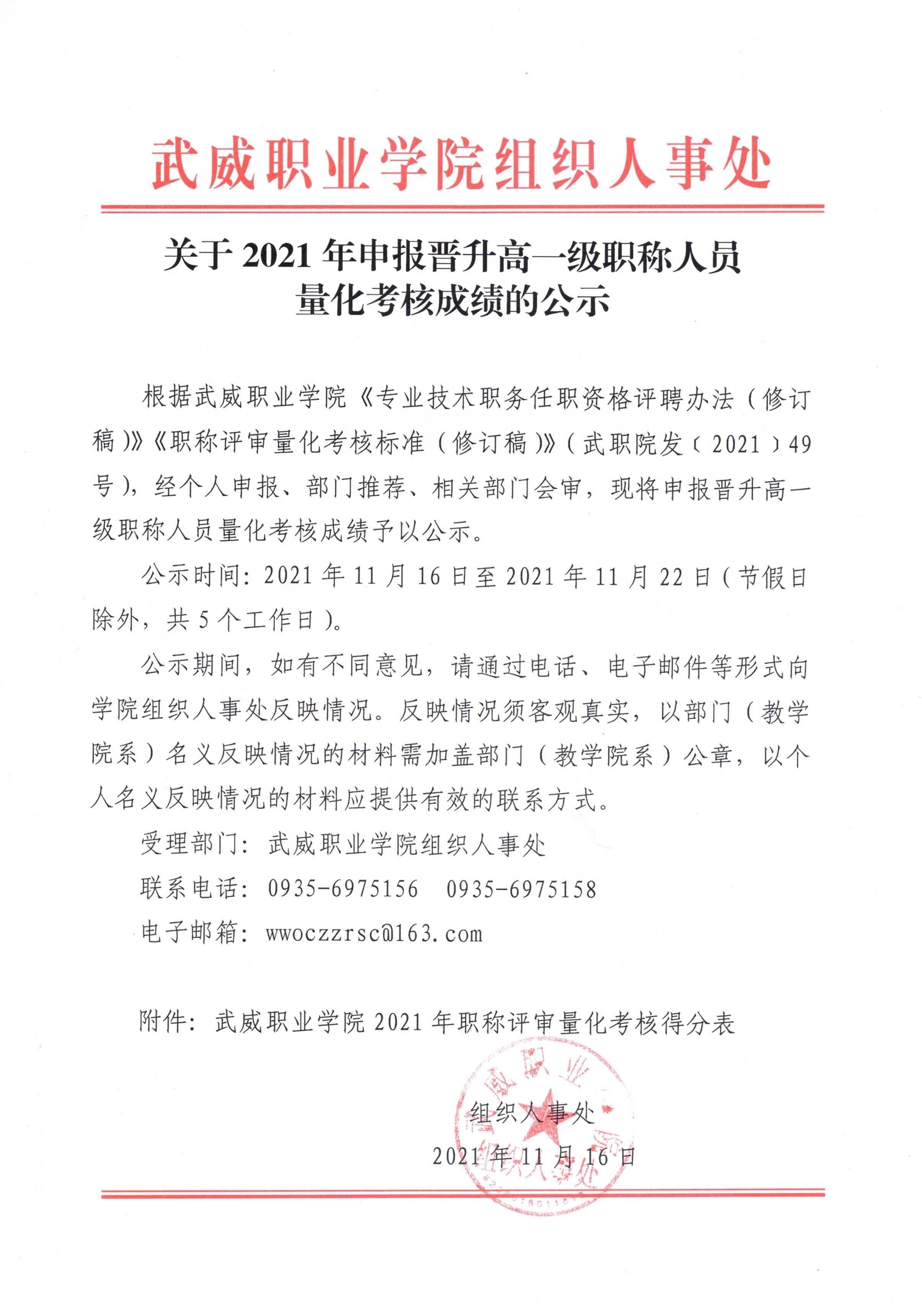 關(guān)于2021年申報晉升高一級職稱人員量化考核成績的公示