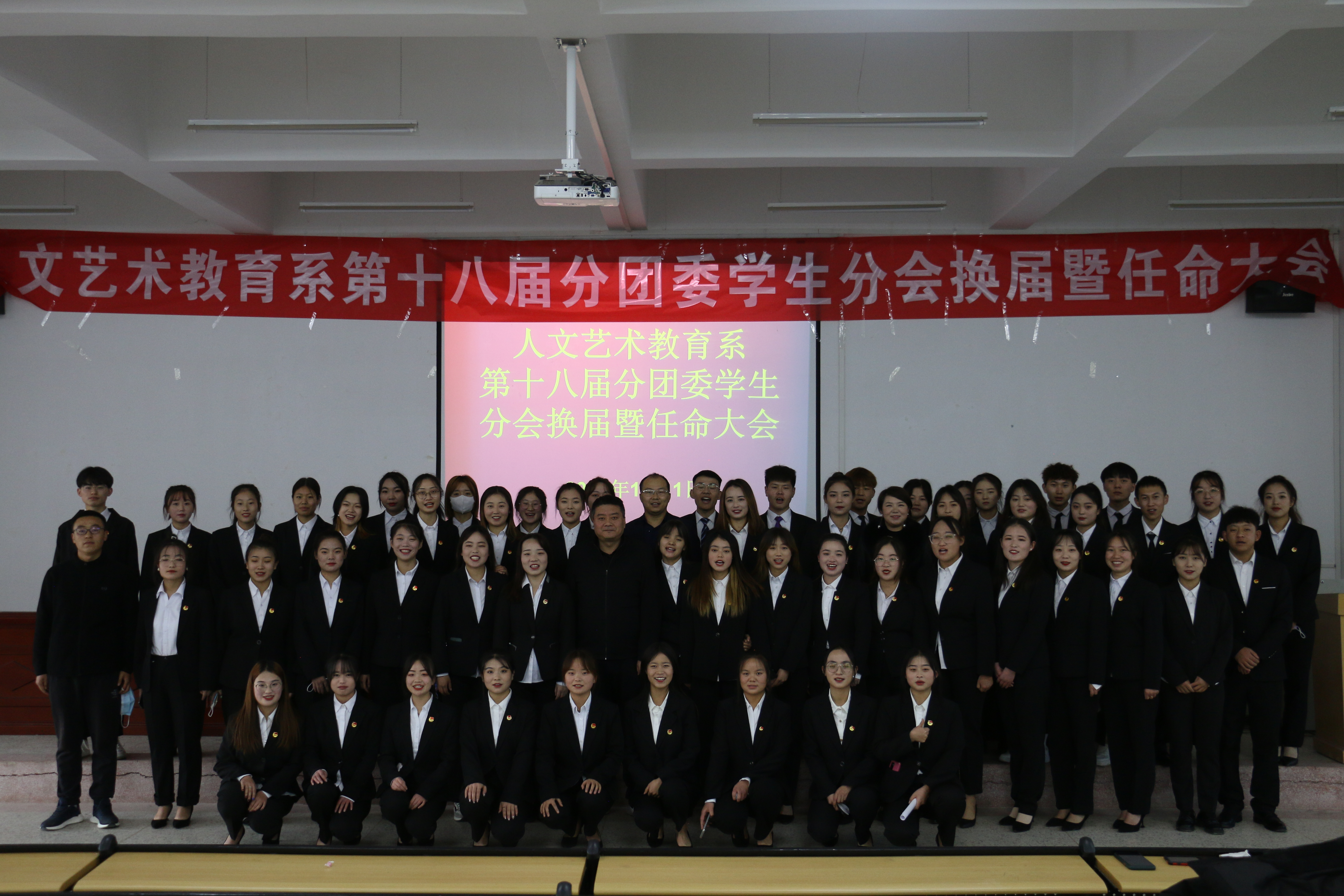 人文藝術教育系第十八屆分團委學生分會換屆暨任命大會于2021年12月1日在勵勤樓階梯教室成功舉行,參加本次會議的成員有人文藝術教育系副主任李欣、系分團委書記唐鑫基、輔導員馬銀輝、李怡璠及20級、21級全體師生代表。