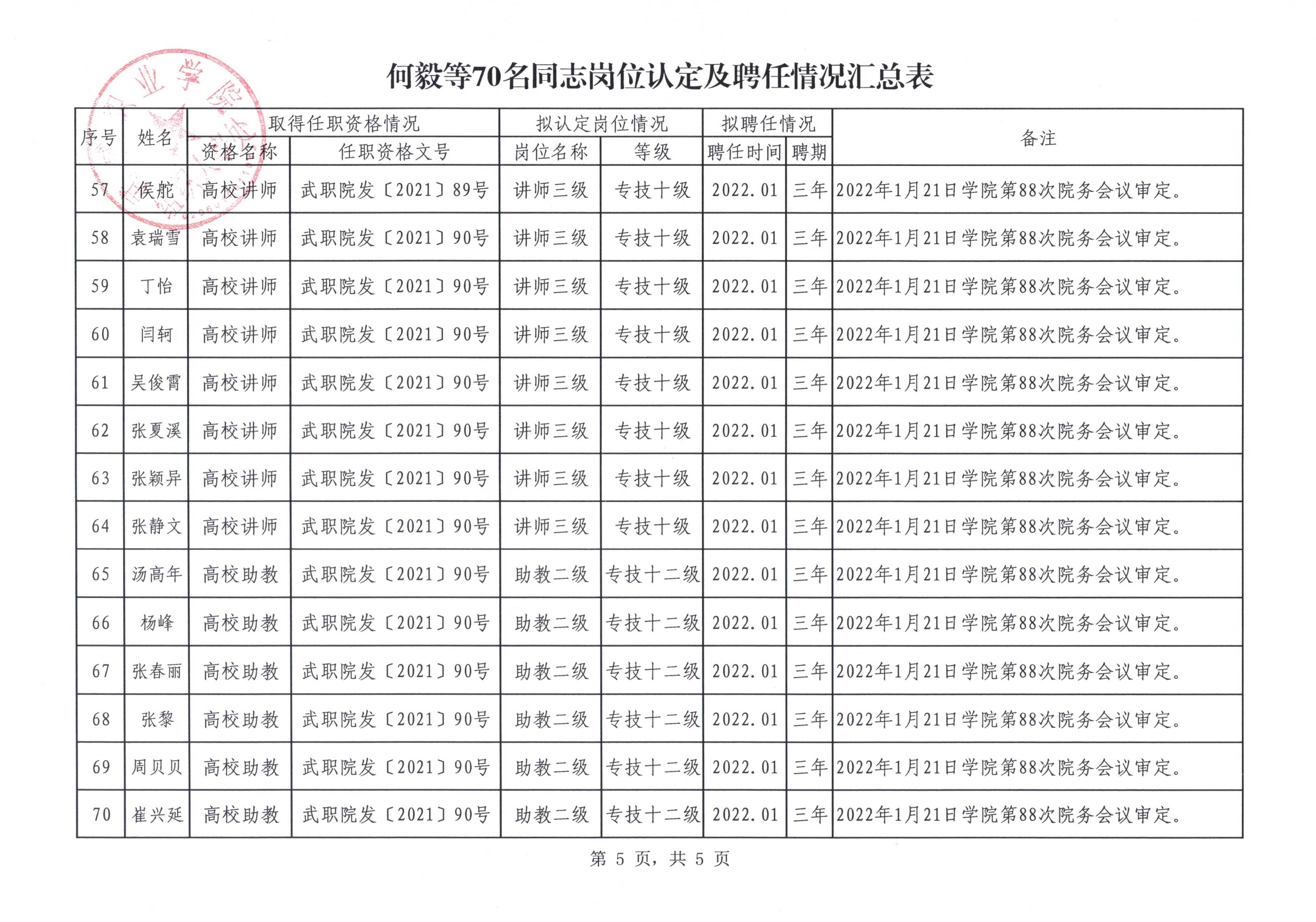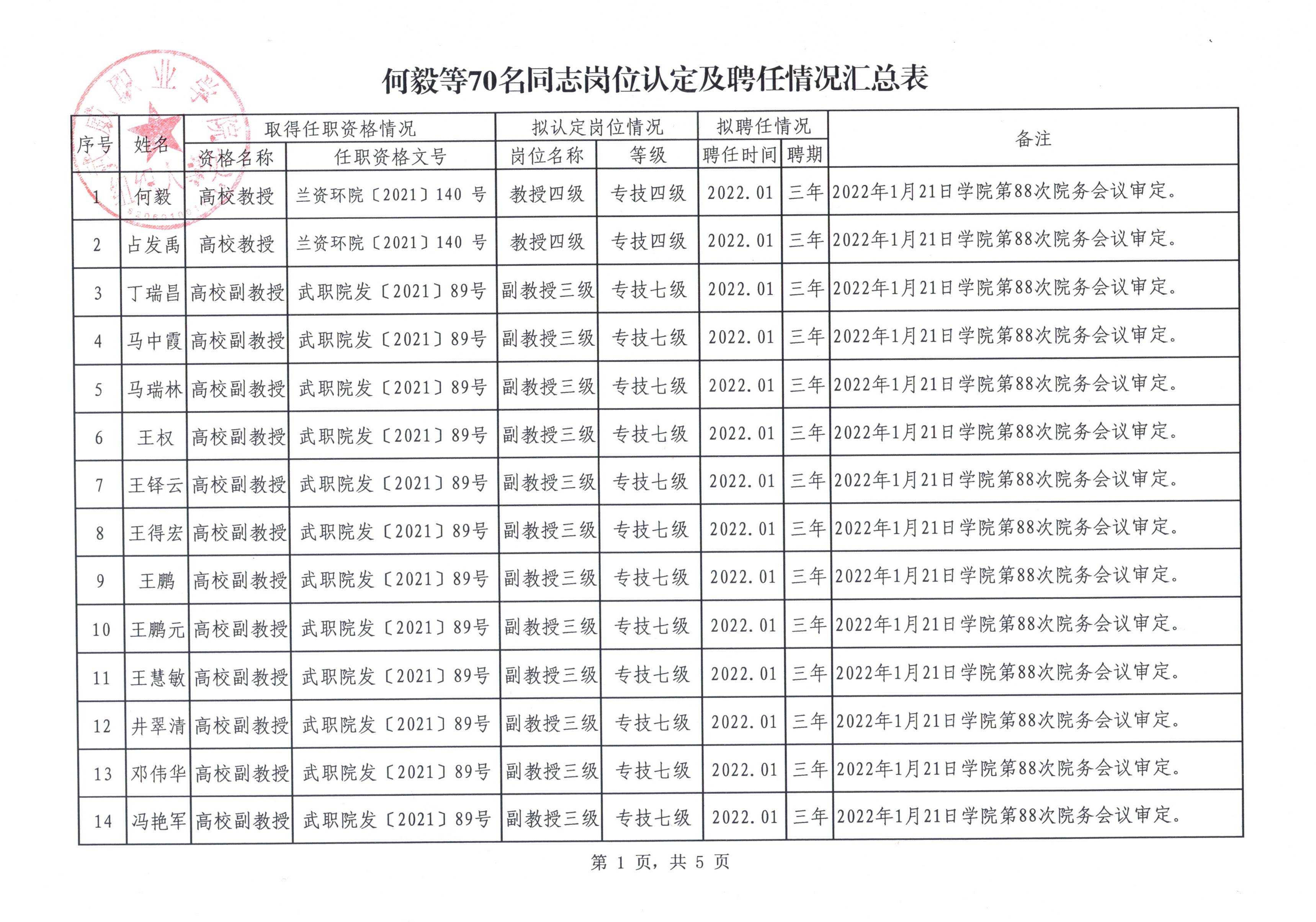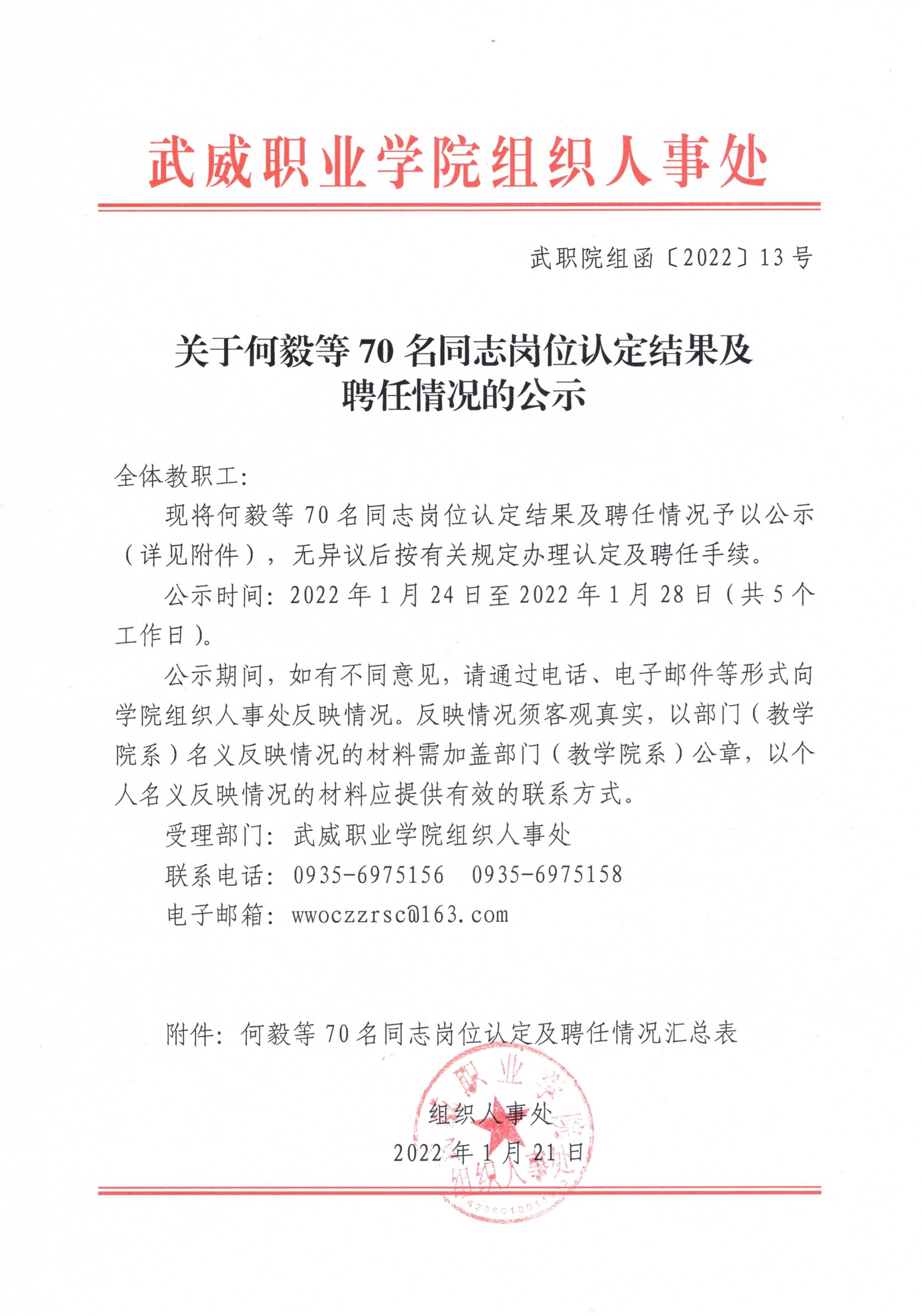 關(guān)于何毅等70名同志崗位認(rèn)定結(jié)果及聘任情況的公示