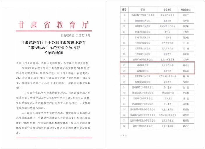 中科低碳新能源技術(shù)學(xué)院黃述杰負(fù)責(zé)的“光伏工程技術(shù)”和經(jīng)濟(jì)管理學(xué)院晉藝波負(fù)責(zé)的“旅游管理”2個(gè)專業(yè)獲評甘肅省職業(yè)教育“課程思政”示范專業(yè)。
