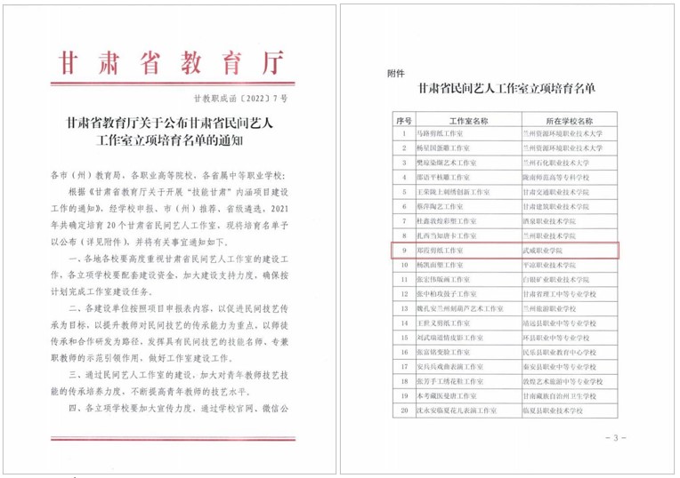 民間藝人、學(xué)校非遺技能指導(dǎo)教師鄭霞合作申報(bào)的“鄭霞剪紙工作室”,獲評甘肅省民間藝人工作室。