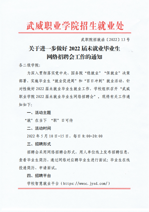 武威職業(yè)學(xué)院2022屆未就業(yè)畢業(yè)生就業(yè)促進(jìn)周暨網(wǎng)絡(luò)招聘會(huì)邀請函