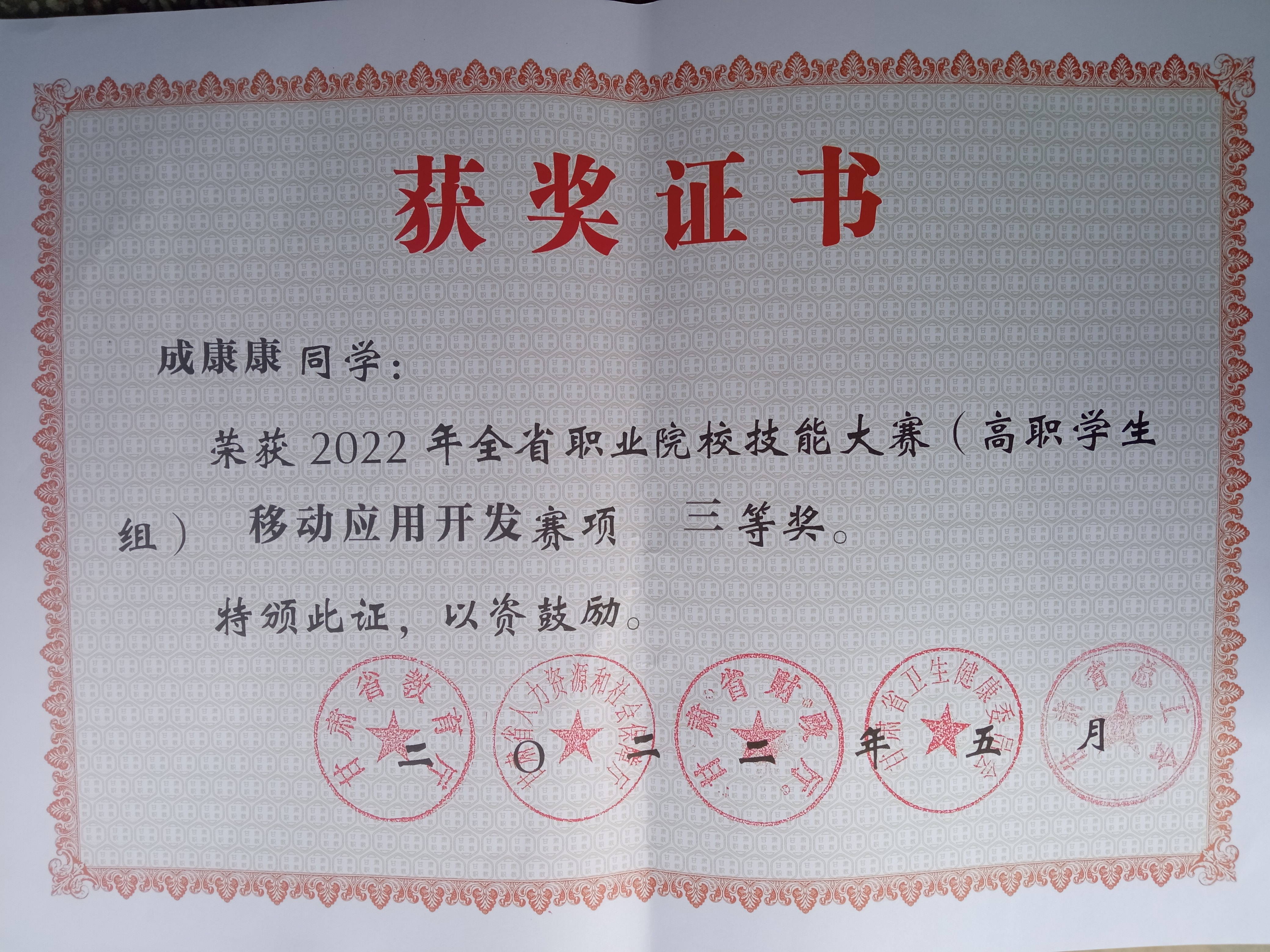?4月26日,2022年甘肅省職業(yè)院校技能大賽移動(dòng)應(yīng)用開發(fā)賽項(xiàng)在武威職業(yè)學(xué)院舉辦,信息技術(shù)學(xué)院在該賽項(xiàng)中獲學(xué)生組一等獎(jiǎng)、三等獎(jiǎng)各1項(xiàng)。