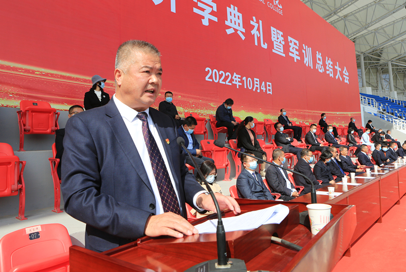 金秋的校園陽光明媚,嘹亮的歌聲唱響青春。10月4日上午9時,在莊嚴隆重的升國旗儀式結束后,2022級新生開學典禮暨軍訓總結大會在體育場拉開了帷幕。學校黨委書記、校長趙明出席大會并講話,涼州區(qū)人武部上校政委丁俊強受邀出席。校領導翟存祥、王永緒、田迎春、何毅、陳曉煜、張開禮出席大會。大會由學校黨委委員、副校長王守云主持。
