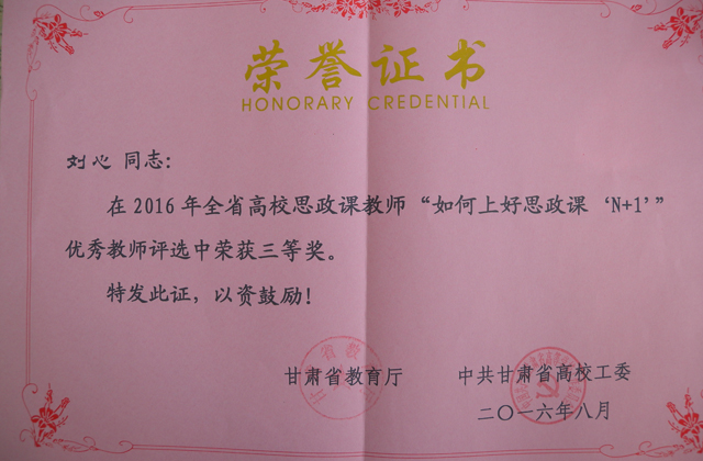 根據《甘肅省教育廳 中共甘肅省高校工委關于開展“如何上好思政課‘N+1’”優(yōu)秀教師評選活動的通知》要求,我系劉心教師積極參加,最終喜獲由甘肅省教育廳 中共甘肅省高校工委頒發(fā)的在2016年全省高校思政課教師“如何上好思政課‘N+1’”優(yōu)秀教師評選中榮獲三等獎。