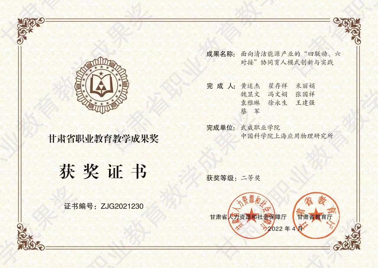 中科低碳新能源技術(shù)學院榮獲2021年甘肅省職業(yè)教育教學成果獎二等獎
