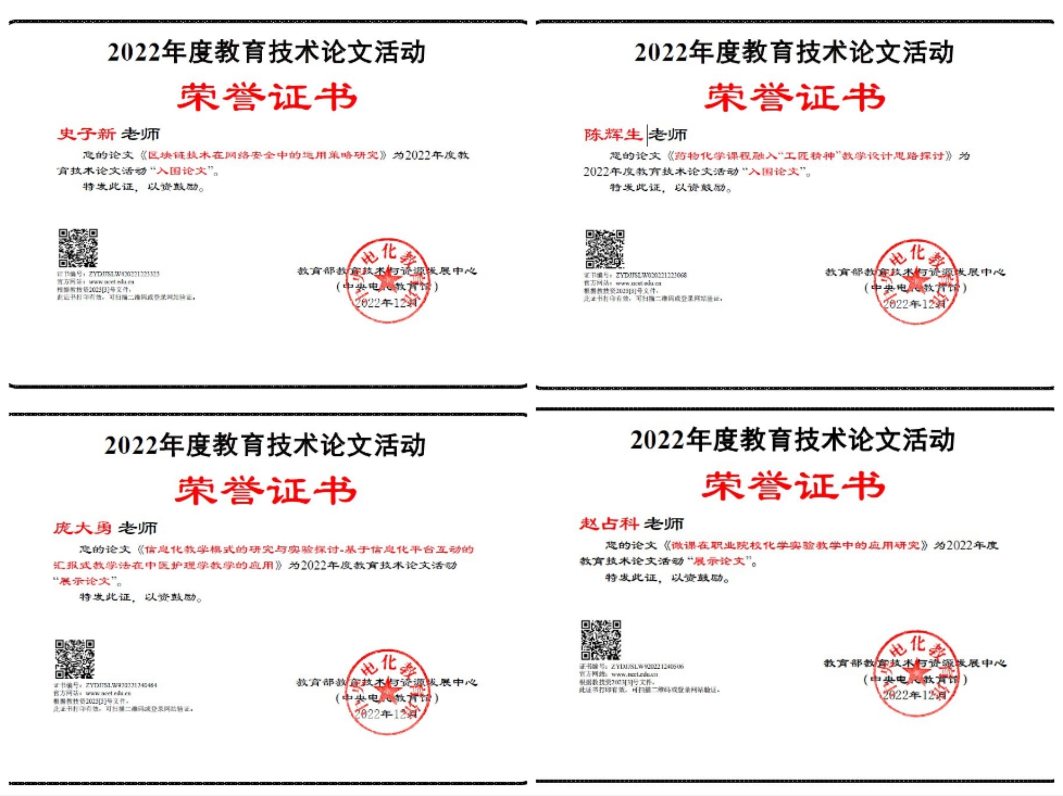 近日,教育部教育技術(shù)與資源發(fā)展中心(中央電化教育館)2022年全國師生信息素養(yǎng)提升實踐活動(第二十六屆教師活動)評審結(jié)果出爐。學(xué)校趙占科、龐大勇、史子新、陳輝生四名教師的教育技術(shù)論文被分別評為展示論文和入圍論文,學(xué)校在2022年度教育技術(shù)論文活動組織工作中被評為突出貢獻學(xué)校。