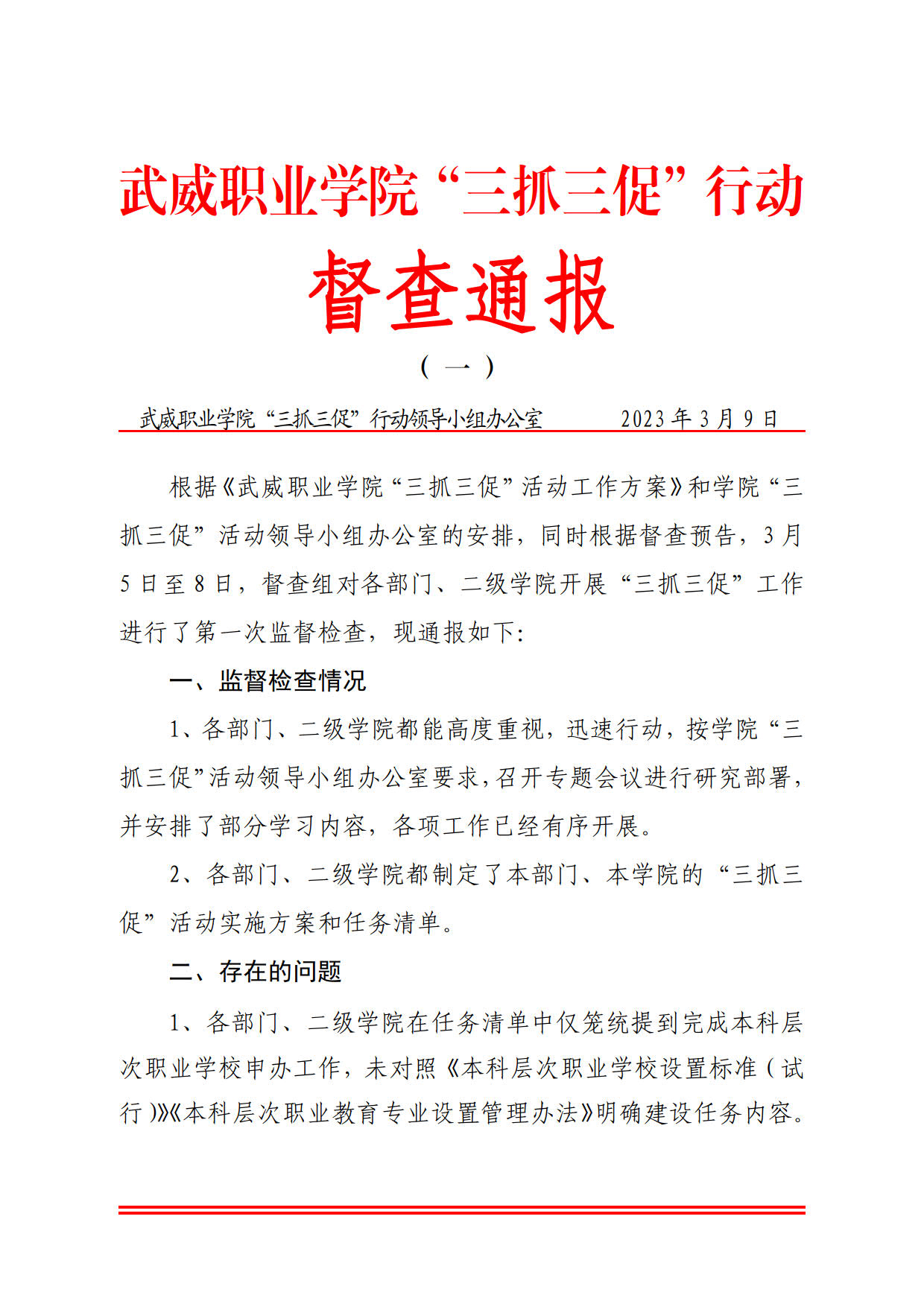 武威職業(yè)學院“三抓三促”行動督查通報(一)