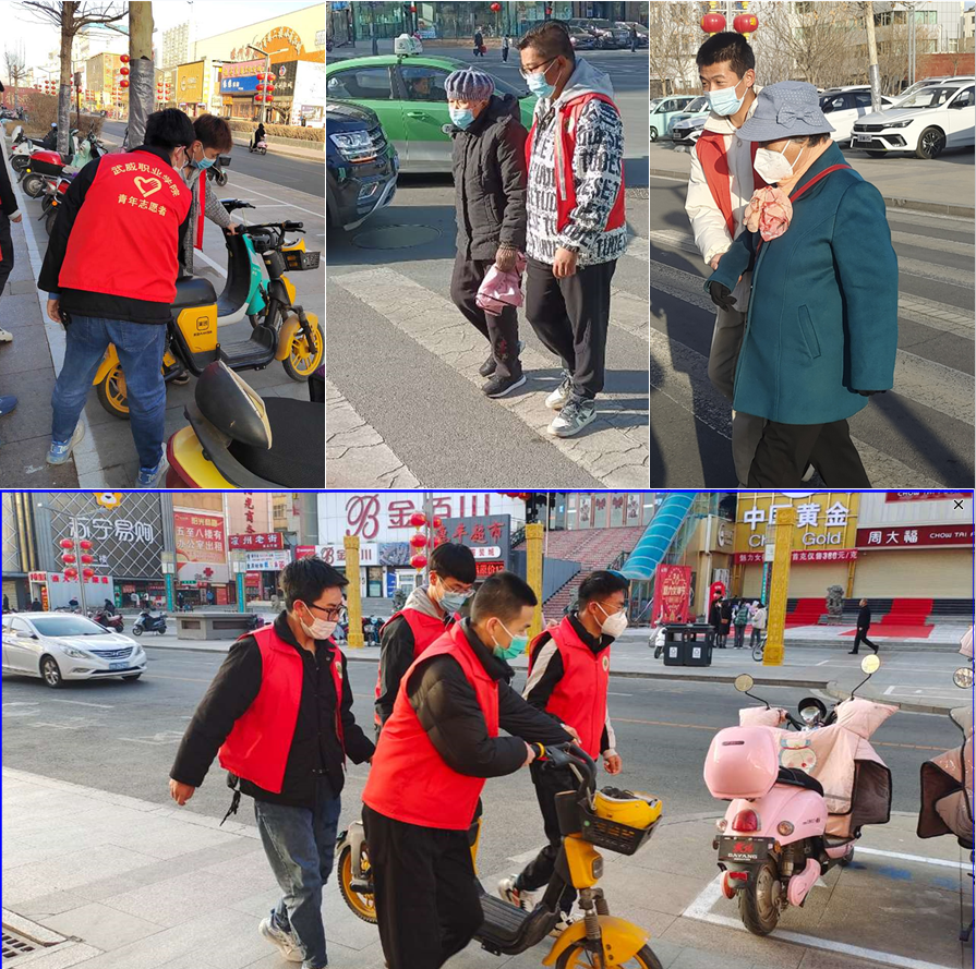 第二組志愿者在文化廣場十字路口配合交警進行文明交通志愿服務,引導大家維護交通秩序,文明出行。幫助行動不便的老人過馬路,整理擺放路邊共享單車,電動車。
